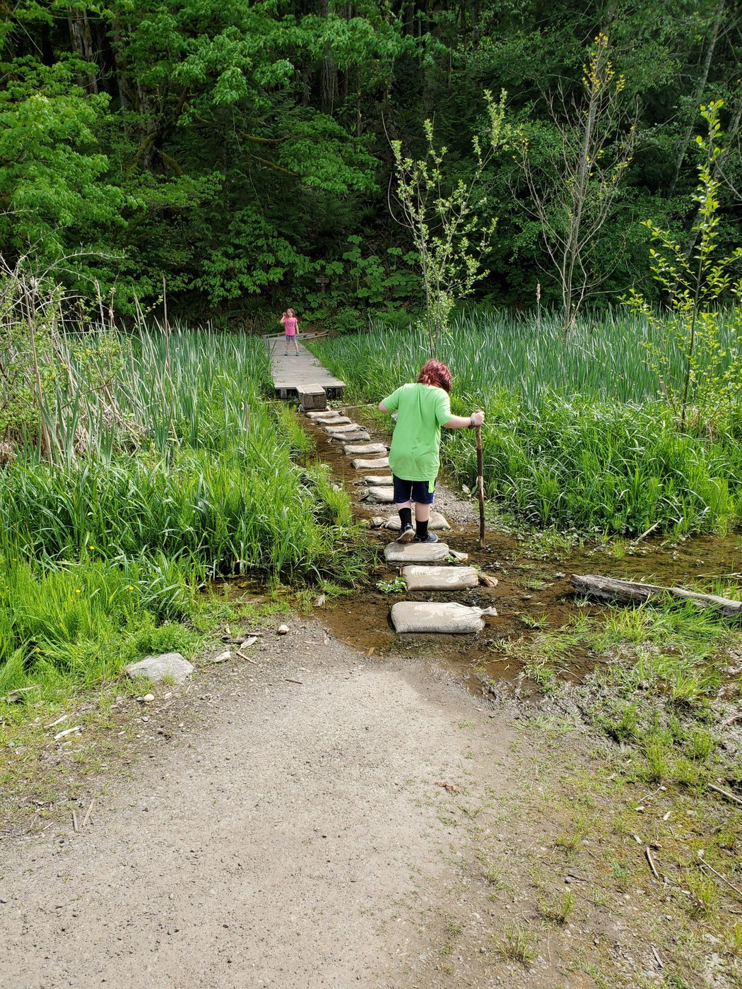 It was a beautiful hike we took the switchback trail down and went to the stump house. The bridge was alot of fun to cross, there were slugs crossing the path and the Rhododendrons were in full bloom.