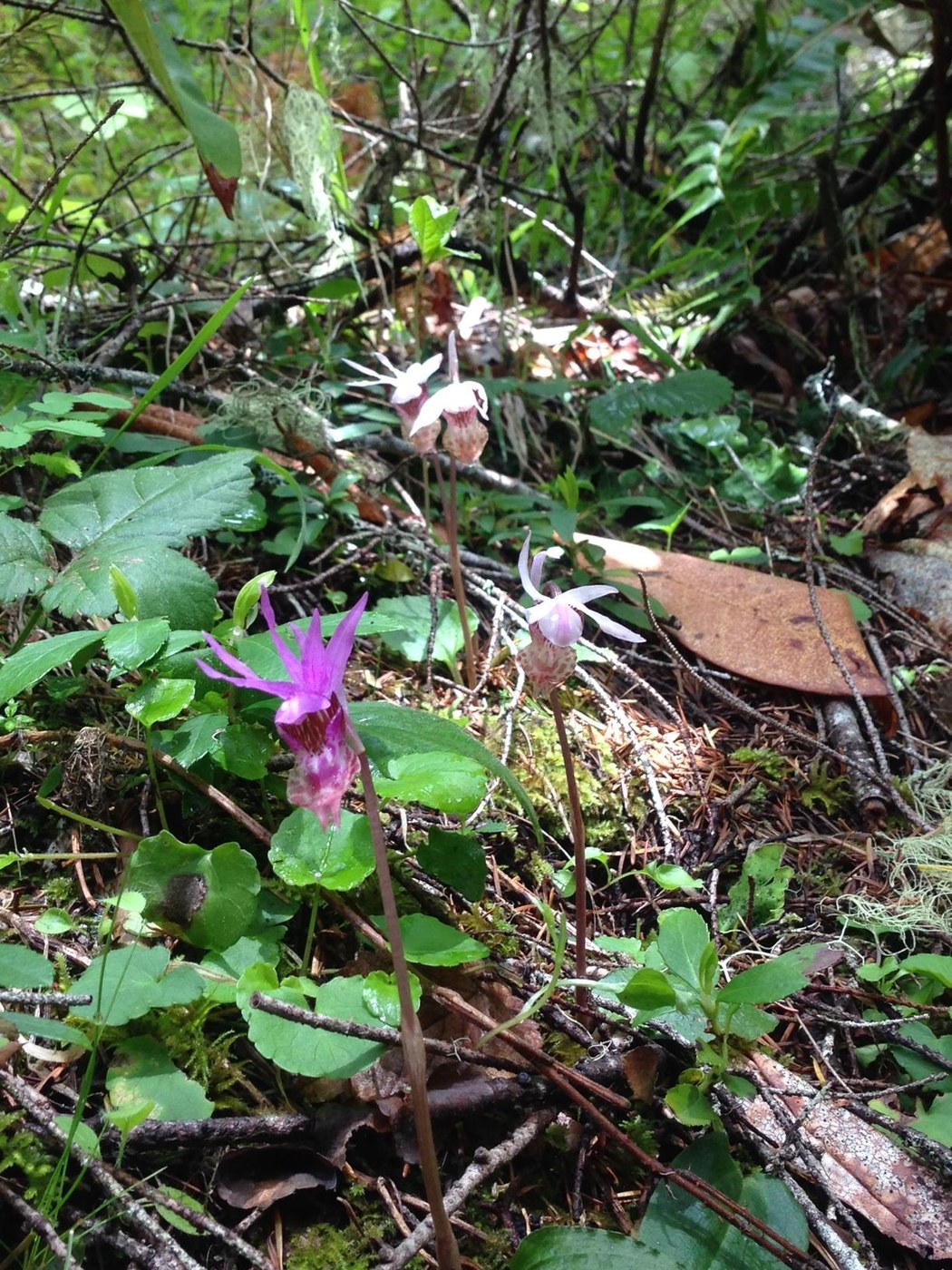 A very kind lady, upon arriving at the summit, asked us if we'd seen the Pink Ladies' Slippers (Calypso Lily). We were immediately on full attention. No, we hadn't seen them. She told us to look about 3/4 mile up from the trailhead, and again near the summit as we descended. Apparently the common name, calypso, comes from the Greek meaning concealment. They flourish inconspicuously on the floor of conifer forests. We found them growing in a stand with hues ranging from deep pink to a very light lavender. They grow in undisturbed forests and do not survive transplanting.