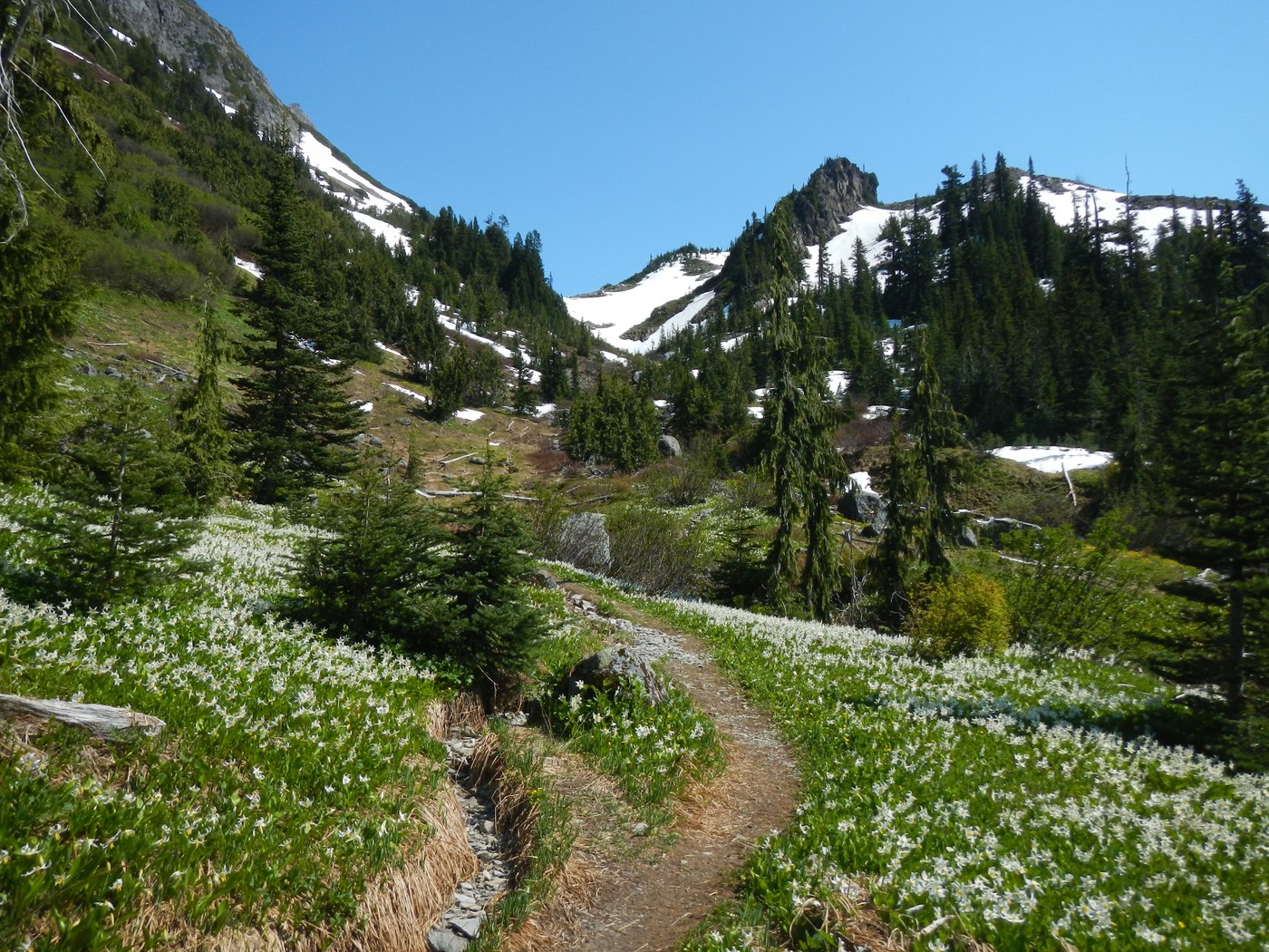 Some snow fields to cross on the trail between Glacier Meadows campsites and the Lateral Moraine viewing point. Many Avalanche Lillies in bloom above tree line. Entire trail is in good condition, except there are some downed trees on trail between Elk Lake and Glacier Meadows. Just a few bugs encountered during the entire 5 day hike. The most noticeable wildlife are the birds, singing their songs from sunup to sundown. Lots of hikers until 5 mile camp, then hardly saw anyone. You won't see Mt Olympus until the last few steps up to the top of the lateral moraine - pretty exciting! A beautiful hike!