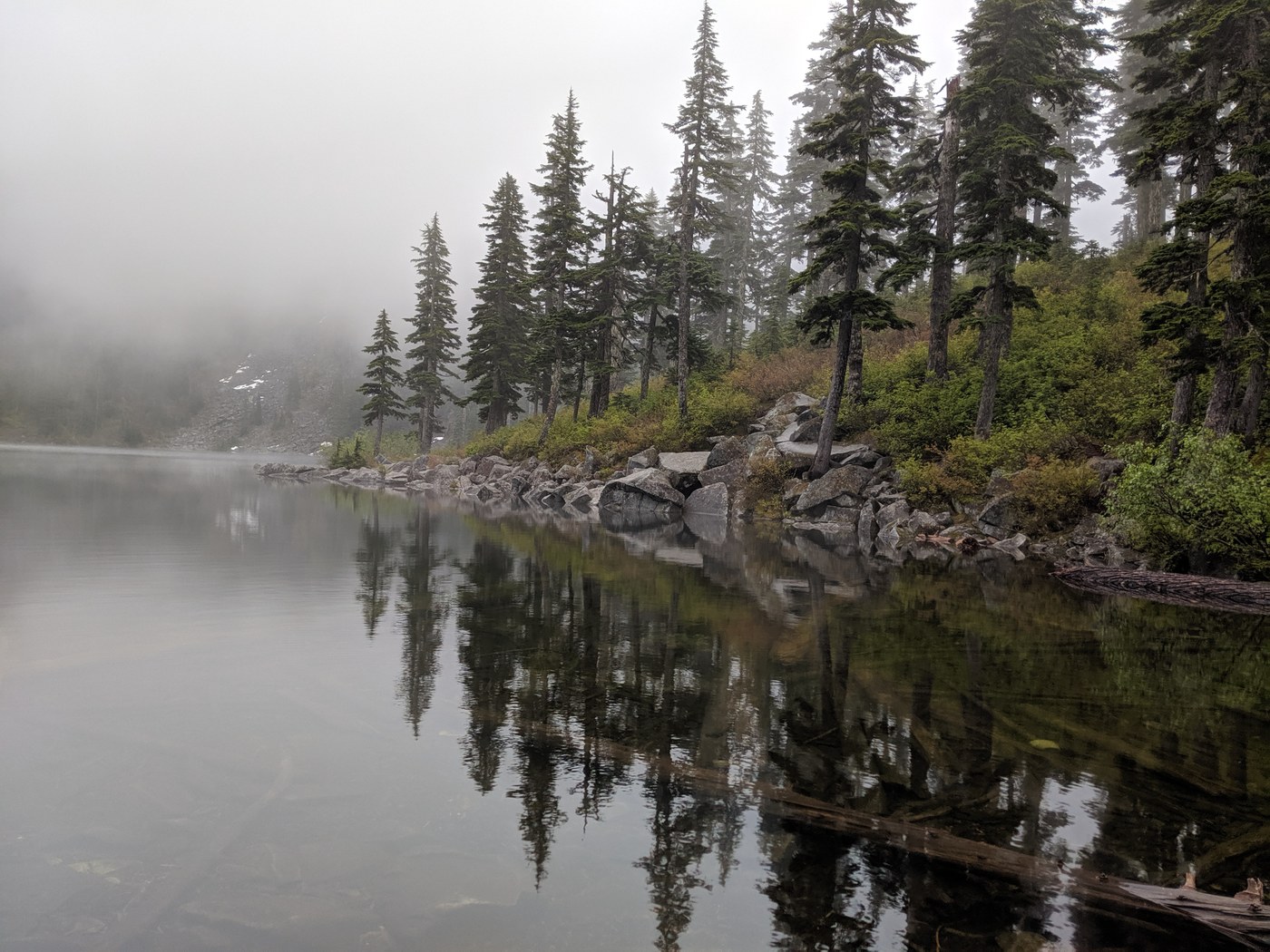 Got to the trailhead about 9:15am and cars were parked along the road for a very long ways. We went to the parking lot and had a vehicle leave as we pulled in. The one beside us left soon after, so certainly worth going all the way in since there seem to be cars coming and going often. Solid cloud cover all the way up, which was nice to have for the exposed trail. The lake stayed shrouded in clouds and we were surrounded by people. Started up Bandera Mountain and was shocked by just how "aggressive" the trail is. We had two leashed dogs and I would argue that the trail is not navigable like that. Great views though. Made it only a little ways up before turning around.