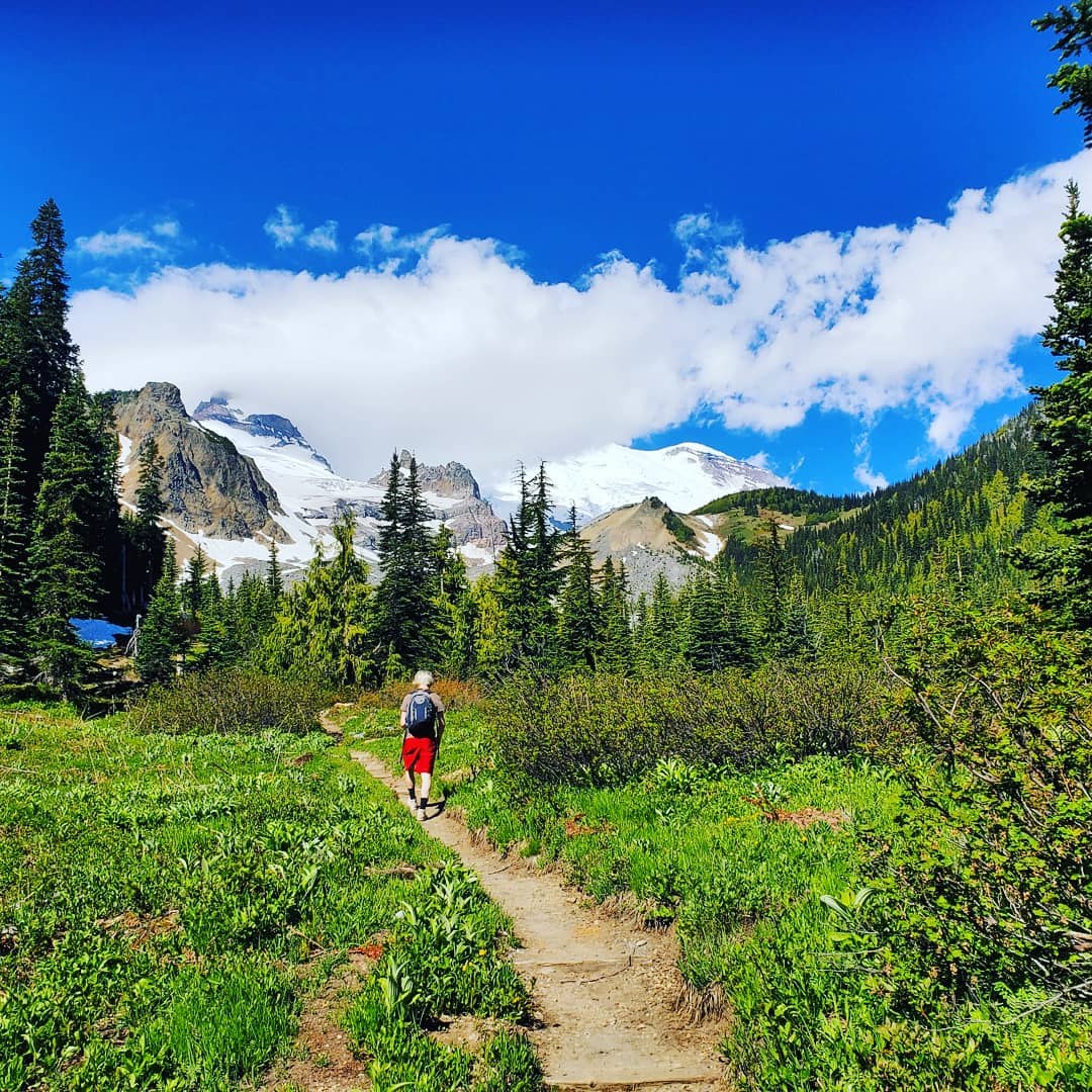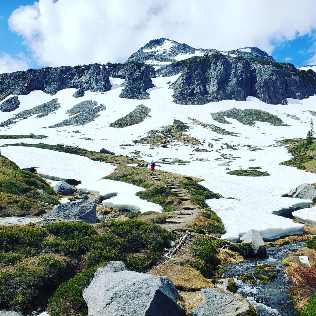 Planned to turn around at the Summerland Shelter but it was so lovely we went on almost to the Gap. Few people for a Sunday - lovely blue skies and piled distant clouds. The trail was clear and in good condition until crossing Fryingpan creek. After the log bridge we encountered patches of snow, which lay in slushy/icy drifts across the trail. Due to the exposure down the gullies, you had to take care with these crossings and I was glad of poles. However, with careful footing others crossed without equipment. It was slightly more challenging on the descent, where shaded portions were icey and gaps are forming under the ice crust. There were only 6 crossings and so this was not a major impediment, but better to be prepared. Up top, the elevated path was clear of snow, but many snowfields remained. We met rangers with skies, hoping for a few runs. The marmots were out and enjoying the sun. A fabulous hike to be recommended for anyone enjoying views, easy footing (other than snow patches) and/or a lovely camping spot.