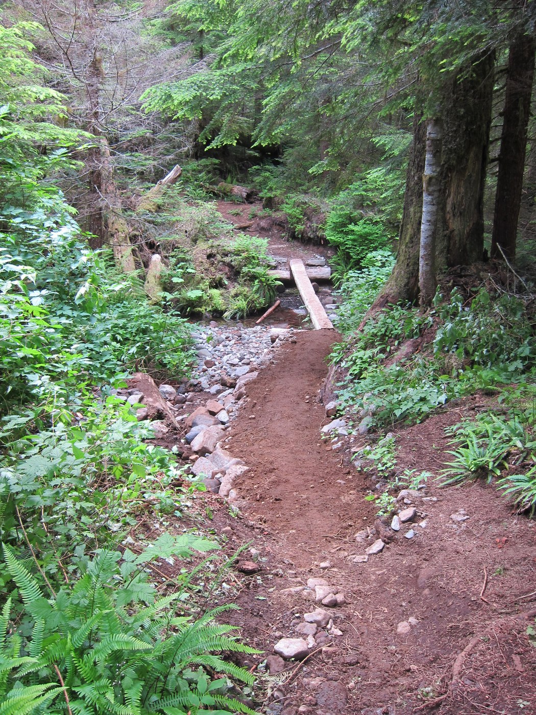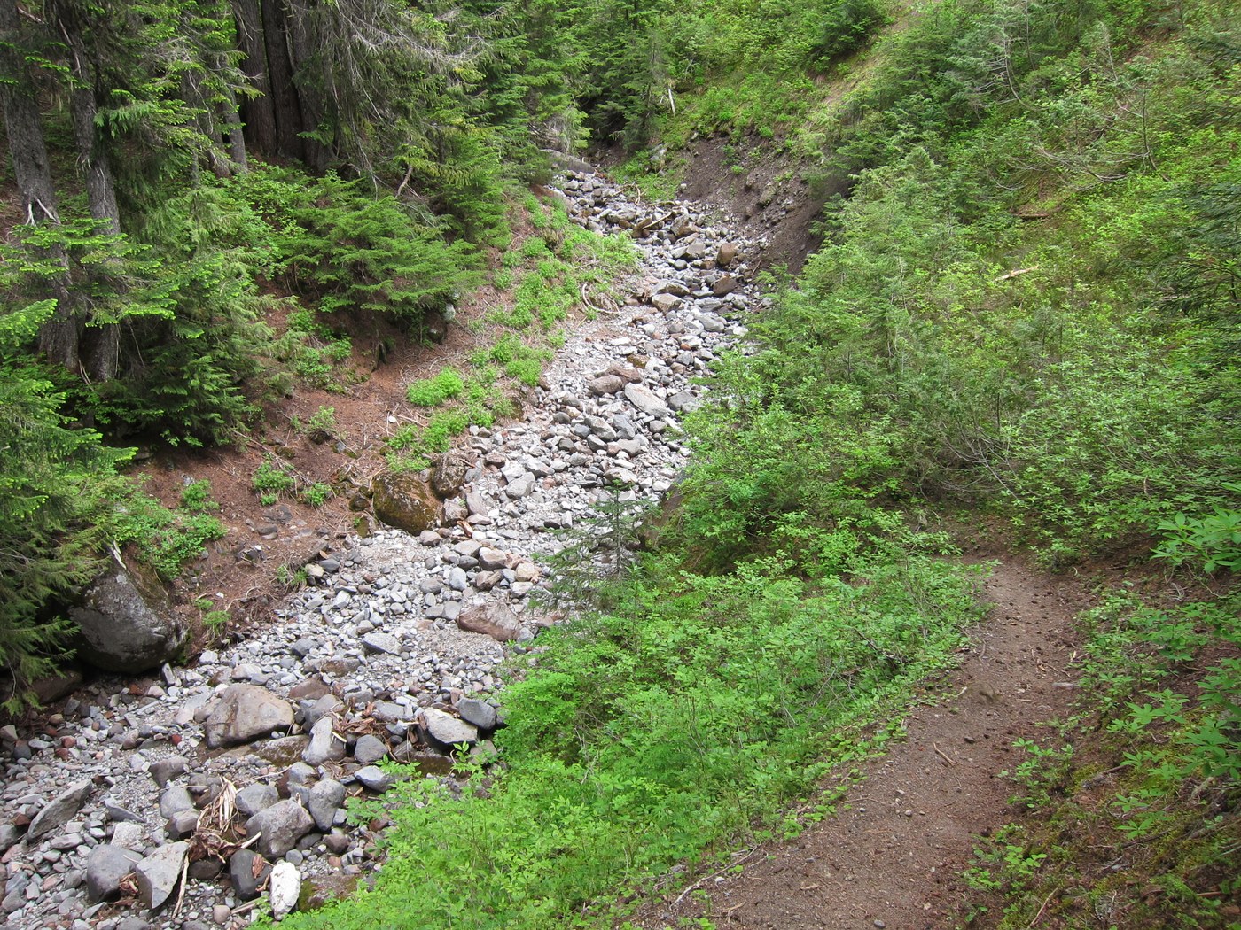 It took some time dodging all these potholes with my low clearance car. Finally, I made it to the trailhead at the end of FR 38 in one piece. The WTA bridges across the major rivers and creeks work fine. The trail is in good shape especially since on the lower part some trail-angels were working lately. Thank you! On the whole trail I only had to climb over one big log further up the trail. The creek crossings dried out by now. It is a steep climb up to Mazama Park through a nice Hemlock forest and can be used to reach Park Butte. I liked this hike very much although, the Mount Baker National Recreation Area trail from the Baker Lake side to Park Butte is much less strenuous. My hike yesterday lead me to Cathedral Camp 7.2 miles roundtrip and 2200 ft elevation gain with max elevation of 4850 ft.