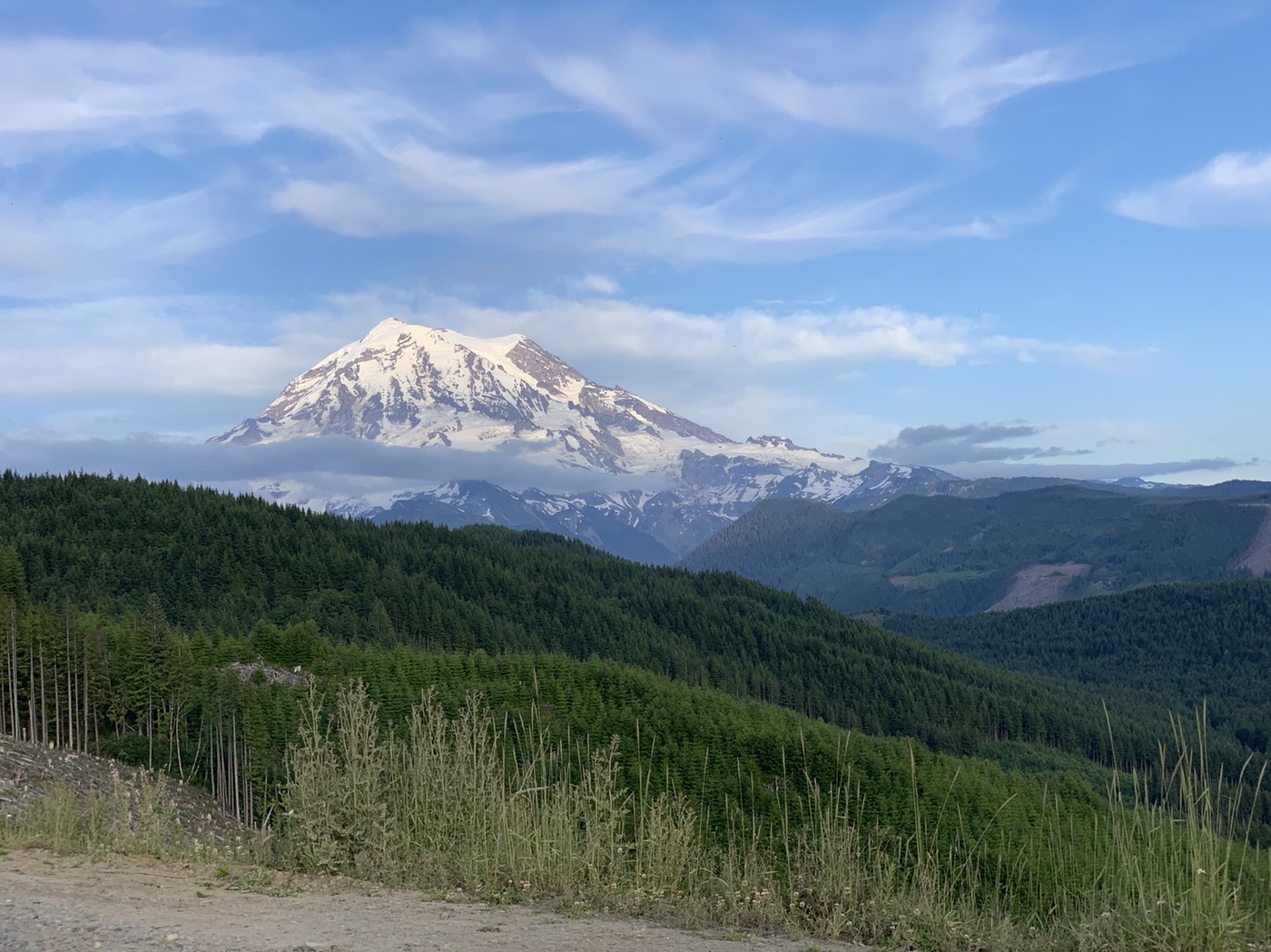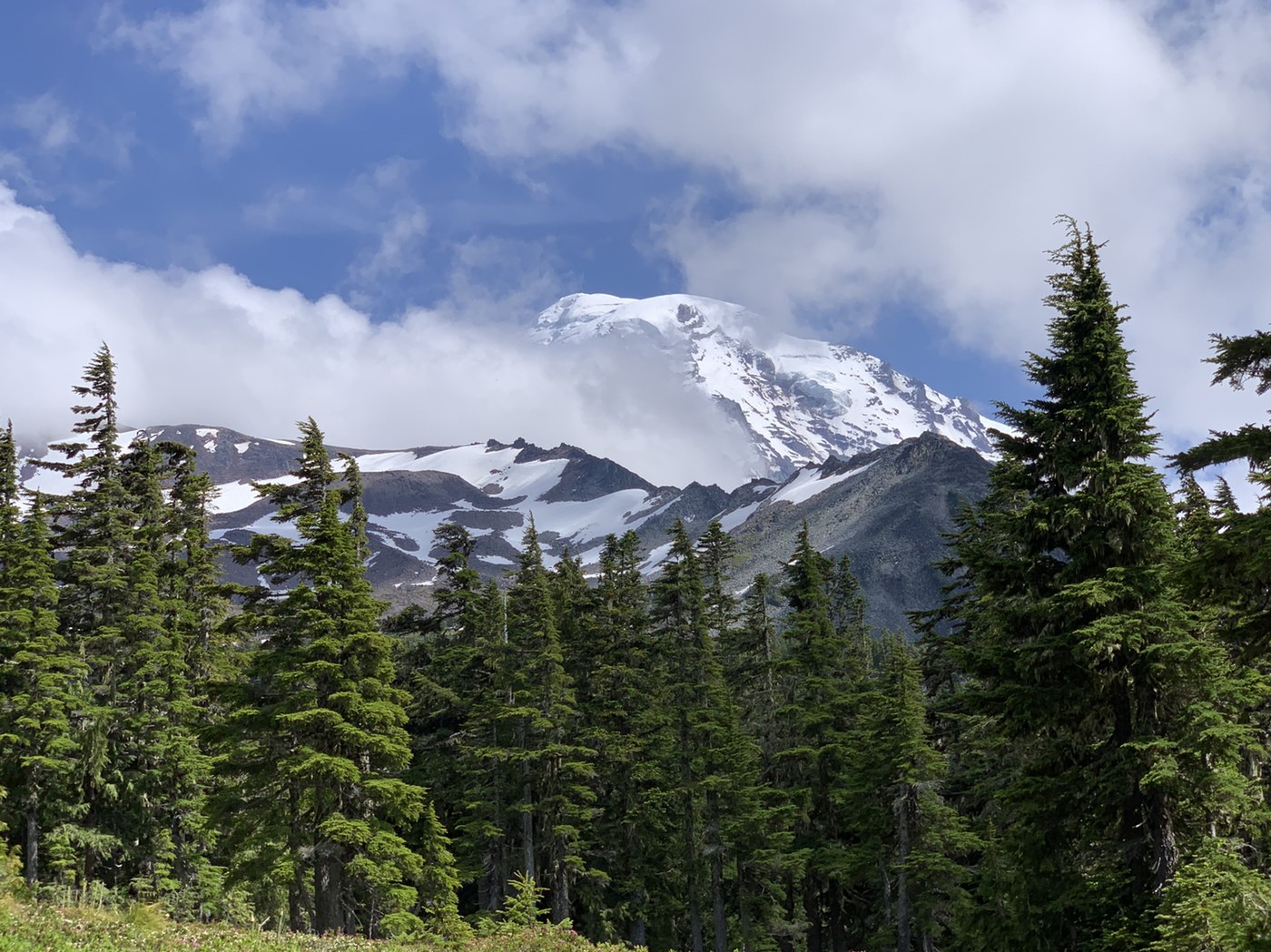 We started out later than usual, arriving on the washboard road (not the greatest road) to reach the trailhead. Many, many cars lined along the road by 12 PM, but we were able to find a spot between some cars and have a short walk to the trailhead, just past the restrooms. Two rangers were checking cars for passes. Since we had arrived later than most, the trail was not crowded. Beautiful day for hiking; trail was wet and muddy in some spots, but overall in great shape. We stopped at a Eagle Cliff viewpoint and also Spray falls (.1 mile from the main trail) and proceeded up the switchbacks to find the meadows. Mt Rainier was on and off obscured by clouds, but fairly visible by the time we reached the meadows. The mosquitoes were awful for a bit once we reached the first meadow. Others had sighted a bear, but we never saw them. Many wildflowers and beautiful bear grass as we went higher on the trail. There were a couple of rangers hiking the trail to keep an eye out for hikers straying off the trail. A good idea there is some monitoring since later we came across a couple of hikers who trampled a field of wildflowers to get to the other side. Very sad to see this indiscriminate abuse. Later driving to return home, we saw tourists collecting foxglove alongside the road!