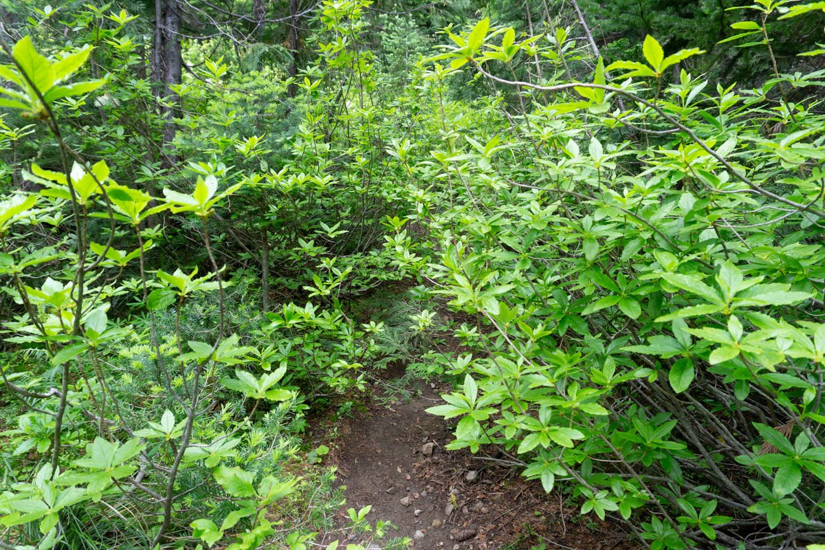 Bugs: Not bad / Trail Condition: Rough, overgrown in some places (pictured). One tree down 1 mile from lake, easy to step over.