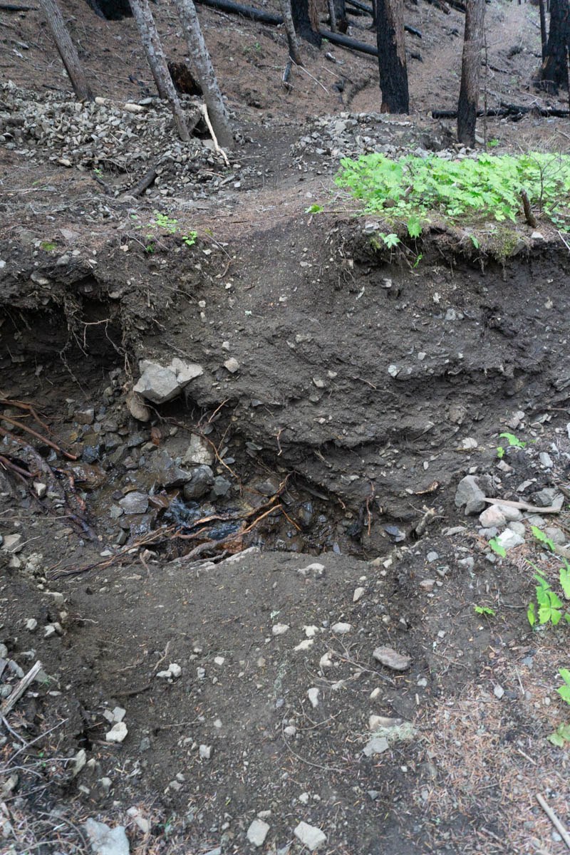 The first section departing Corral Pass on the Greenwater Trail is pretty. The burned trees contrast with the thick greenery growing around the streams. The footing is soft, and won't stand up to heavy traffic for some time. Runoff has eroded the edges, but its safe. There is a nice waterfall that flows down to the trail 1 mile from the pass. Towards the bottom, we saw an old foot burned footbridge with hardware sticking out. There was one set of boot prints and one set of elk? prints the whole way down. We spied Hidden Lake through the trees, but didn't try to find to trail to it. At mile -- there is a log over the trail, easy to step over, but shortly after the trail is washed out completely (pictured). The ground is very soft, so we didn't risk crossing it. There is a spot uphill a bit where you can safely cross but its still soft. The bugs started getting horrible, literal clouds of mosquitoes following us. We stopped to put on picaridin, which helped keep them out of our face but they were landing all over our clothes too. We both ended up with bites on our hips where our clothing had the most contact with our skin.