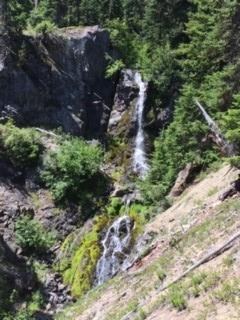 I took a right on the Rattlesnake Trail and headed down. For a while, although there was a quite a bit of blow down, the trail was pretty easy to follow, and most of the worst blow down had use trails around it. There’s one good view of a waterfall, but other than that, the trail isn’t especially scenic. There are a couple of creek crossings where the trail on the other side is not immediately obvious, and the more I descended, the worse the trail became, until I was once again regularly consulting my GPS.