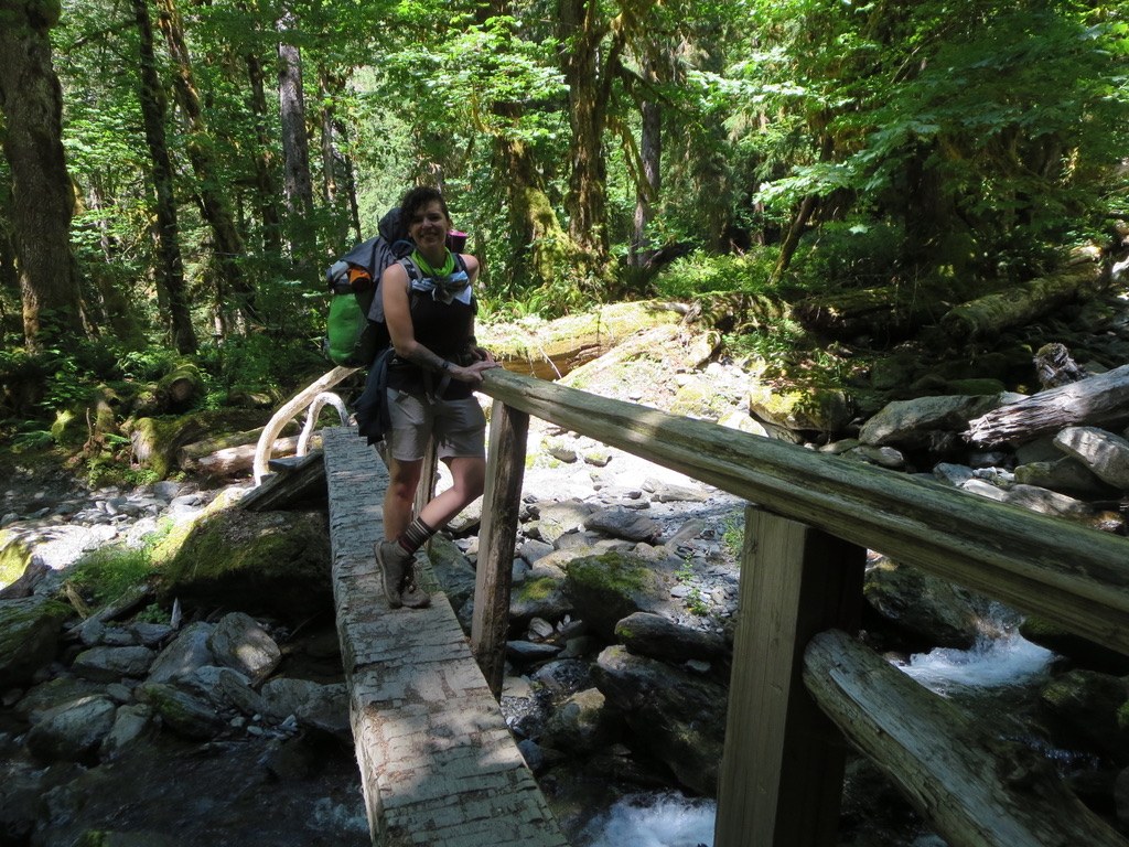 Day 3 - Fri Jul 19th: Excited (and scared - myself - due to Craig Romano's note of this being "bear abundant area") we hit the trail. We went easy. The goal of our trip was to enjoy nature and the journey, to reflect on Diego's life and our lives now without him. The goal was not to beat a determined pace, or get to a determined point or at a determined time. Going mostly uphill and with eyes wide opened to the new experience we arrived to Pony Bridge and decided to camp there. There were tons of bugs, but our natural repellent was amazingly good (REPEL Plant-based lemon-eucalyptus): No bites, and we are both those who always get huge hives.... The campsites were empty. We walked around to scout the area, went down to the creek, found a place for our bear canister, determined our "bathroom zone", enjoyed our surroundings and happily claimed our first night in the forest. Temperature went down to chilly 39F. Food: Breakfast: Oatmeal on Quinault Lake - Lunch/Dinner: leftovers from day before.