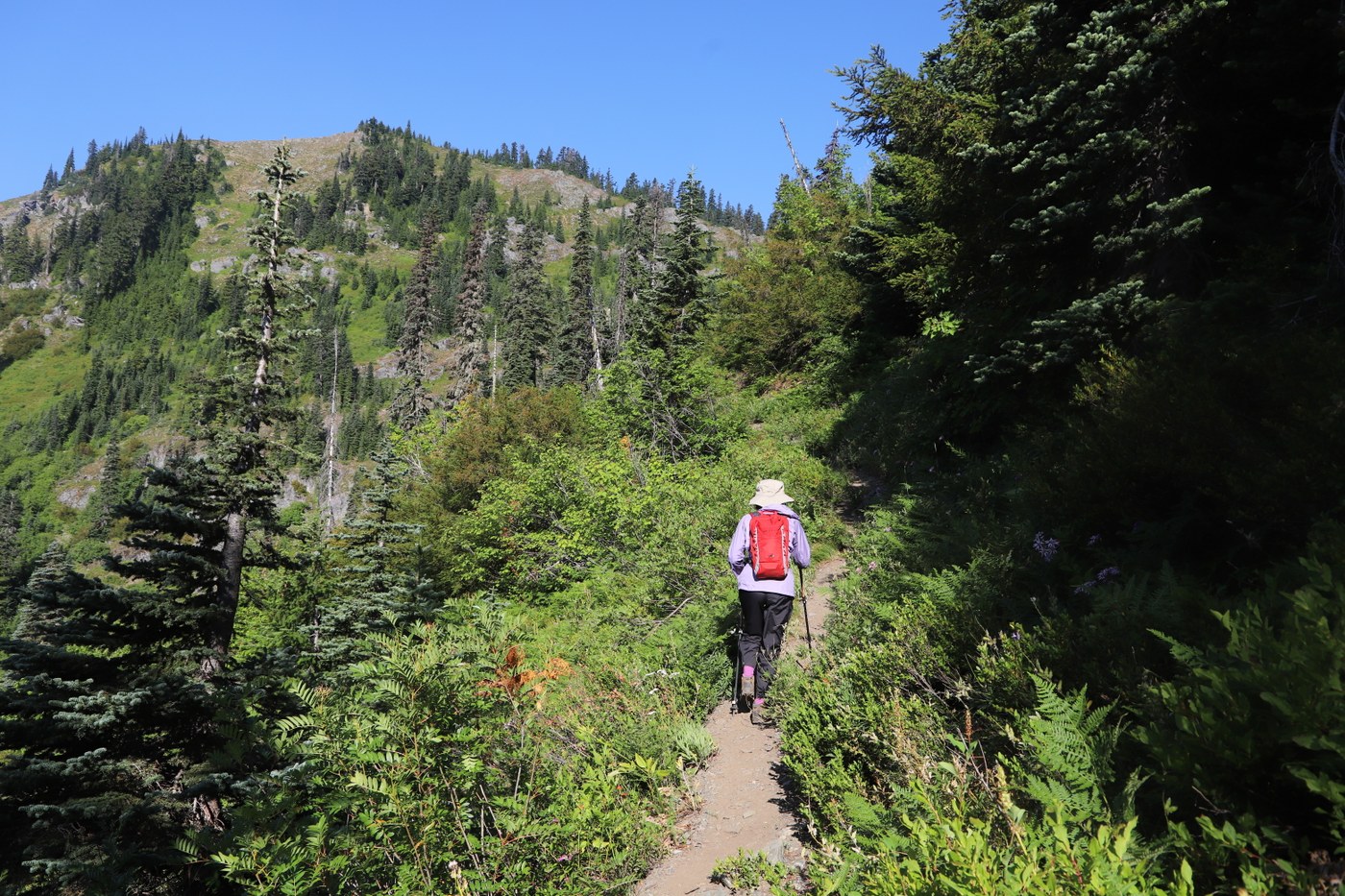 This is what I would describe as a steep hike. It's pretty much all uphill except for a short stretch of relatively level trail along the ridgeline. Some of the trail is very steep. The trail is narrow for much of the first mile with heavy growth on both sides of the track. It is easy to step off the trail if you are not careful. Near the top of the first ascent it steepens noticeably. Once on top you will reach an intersection with the Thorp Mountain trail. Be sure to turn to the right if you want to go to the lookout. The next half mile is the easiest part of the hike. When you get to within 1/2 mile of the lookout, the trail becomes very steep. There are spectacular vistas in all direction to make the climb worth the effort. We were lucky enough to have a cloud free day and Mount Rainier was especially beautiful. Wild flowers were in abundance for the entire hike.