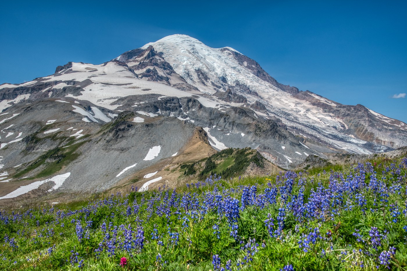 The Wonderland trail is in pretty great shape, you can tell it's incredibly well used but it must see a lot of maintenance. During some of the switchbacks up to Panhandle Gap there are a few little snowfields to cross, but the snow was pretty soft when we made our way out and our way back for that matter, so no traction was needed there for us. After getting to the top of Panhandle Gap we made a left and headed towards to the Sarvant Glacier XC zone to find a place to camp. We ran into an extremely friendly ranger who told us where they generally recommend for camping and we headed that way. The park only allows one group of a max of 5 people in this area per night so it's a pretty amazing experience to have this huge section of the park almost to yourself. We set up camp on a durable surface that had beautiful views of Rainier, Adams, a bunch of other peaks, and a tremendous amount of wildflowers on display. We made dinner, watched the sunset and the stars come out and that was it for the day.