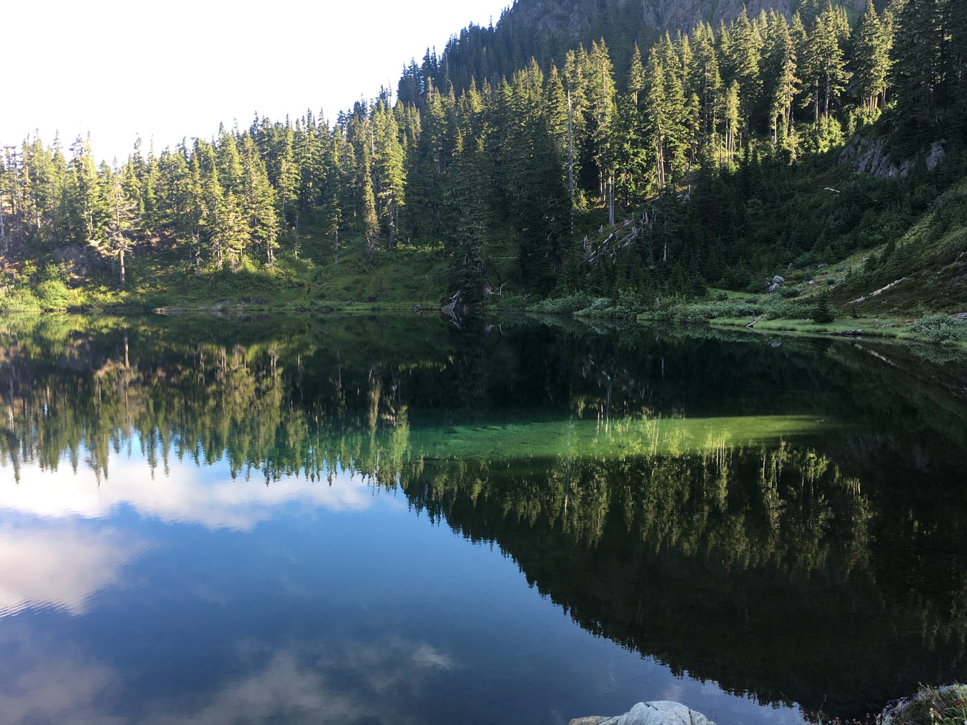 We started from the Artist Point parking lot in the "alternate route" direction noted in the hike info section on Friday. The weather was cool and misty, with clouds intermittently blowing past on the Table Mountain portion of the hike. Descending toward Mazama Lake after the junction with the Ptarmigan Ridge trail, lots of pika were seen and heard. We found a nice spot on a little outcropping on the south side of Hayes Lake, and explored Arbuthnet Lake after pitching our tent. We met a couple who had a completely suspended tent (not a hammock) at Arbuthnet Lake - nifty! On the second day of our stay we ventured out to Ptarmigan Ridge, and the clouds were so dense that we doubled back to our Hayes Lake camp after Coleman Peak. We did see actual ptarmigan, though - what looked like a parent and a few chicks. Wildflowers were still in bloom, and we heard bees buzzing throughout the day, but not many mosquitos or other bugs at all. The photo is of Hayes Lake in the morning sunshine on Sunday.