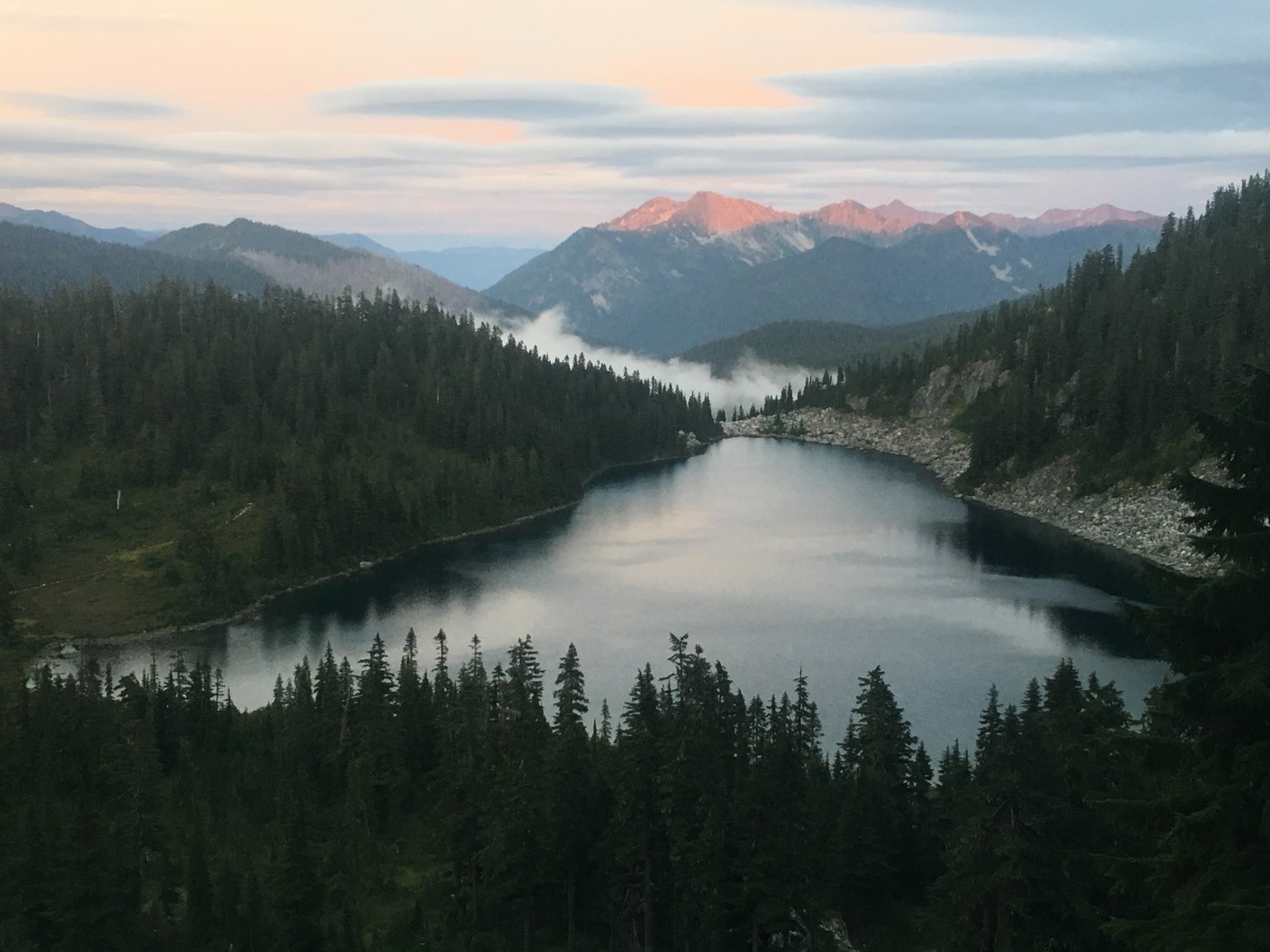 I awoke to a rosy sunrise and carried on up over Grizzly Peak, down Wenatchee Pass and up to Pear Lake where I took a site near the back where the Meadow Creek Trail heads up and over to Fortune Ponds. I had contemplated continuing on towards Benchmark but since I was heading out Top Lake, figured Pear Lake would be better tonight rather than Saturday night with possible crowds.