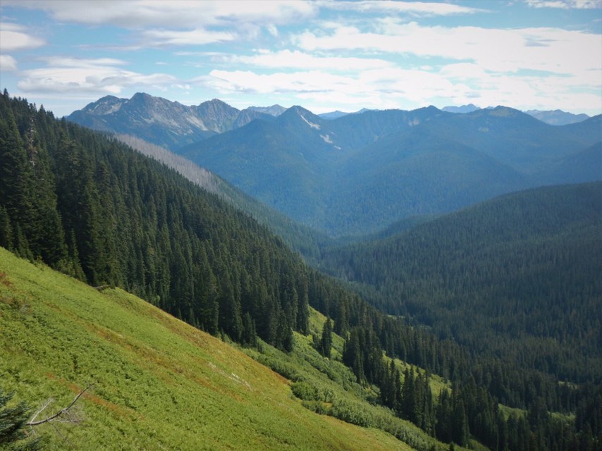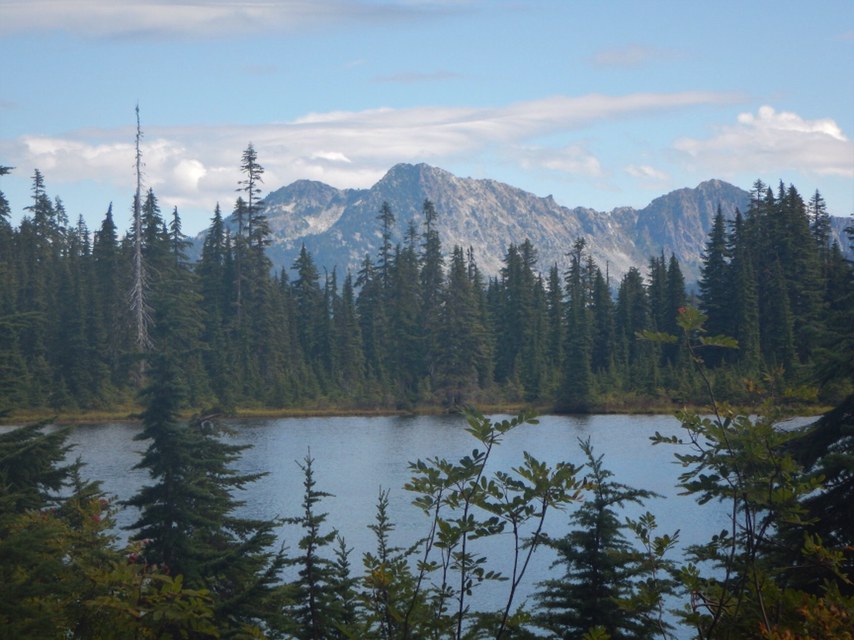 The trail begins through dense forest, slightly overgrown in places. The trail itself is very well maintained and easy to follow. It eventually reaches a wide area charred from a forest fire, which is super cool to walk through. From this point, there are near constant partial-to-full views of the nearby mountains. Once through the burnt section, the trail goes back into forest along a ridgeline until a brief gravelly rise and descent again through 100 feet or so of chalky white rock. Before long you arrive at the bright green slope of an alpine meadow with great views all around. The trail enters the forest once again for the last long descent DOWN to Top Lake. The lake is large, lovely, and peaceful. A nice place to relax and lunch before the tough climb back up to the ridge. Once that part’s done, though, it’s easy going back to the trailhead.