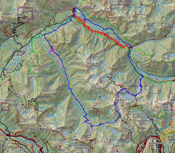 I dreamt up this loop as a training/test run for a 3-day Wonderland attempt. Not one of the 193 Pratt connector TRs mentions Kaleetan, so I figured I’d post it to inspire some folks. The loop came out to 31 miles on Caltopo (likely ~35 miles in reality). The total included 8,000+ feet of gain, around 10 miles on unmaintained trail, the Kaleetan peak scramble, and a couple off-trail miles with of exposed class 3 scrambling. It did not disappoint!