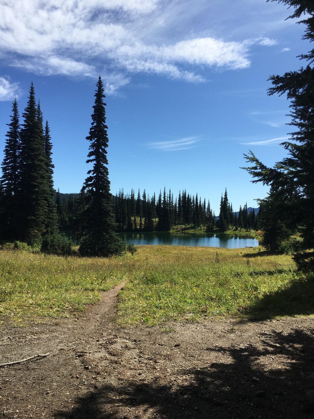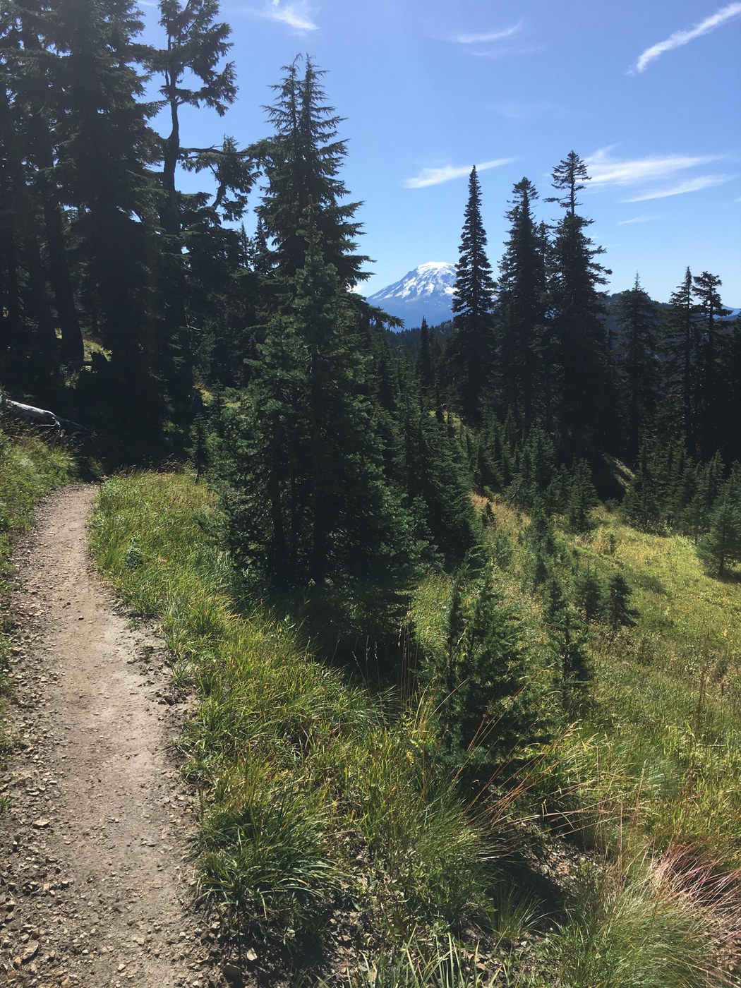 The trail heads up immediately, sustained but not that steep. After 2 miles and 2000 feet things level out a bit. The trail is in very good shape, moderate up and down for 4 miles to Sheep Lake. Here it joins the PCT, with spectacular scenery up and over Cispus Pass and down to some nice campsites at a stream crossing and Cispus Basin.