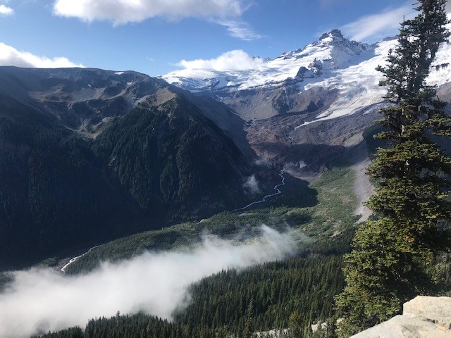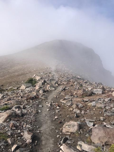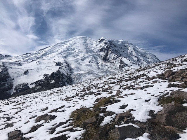 Brr. 41 degrees at the trailhead at 9:15, 48 when I returned at 2:30. The wind was up, and the clouds came and went but never lifted for long. Prospects of views were dicey, but I threaded the needle: left 2nd Burroughs in deep fog, then walked underneath it to arrive at 3rd Burroughs to wide open views of Winthrop Glacier and beyond. Rainier and Little Tahoma look so fine in their new snow! A couple of inches of which I walked in as I approached 3rd Burroughs. After 20 minutes at the summit, the clouds came back in earnest and it was time to go.