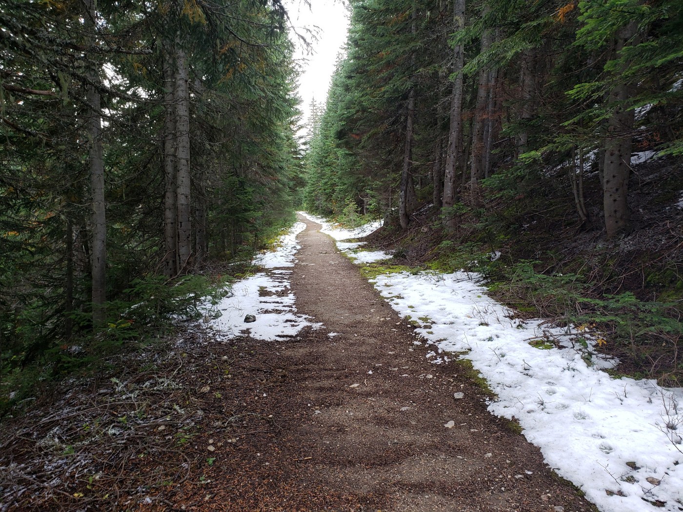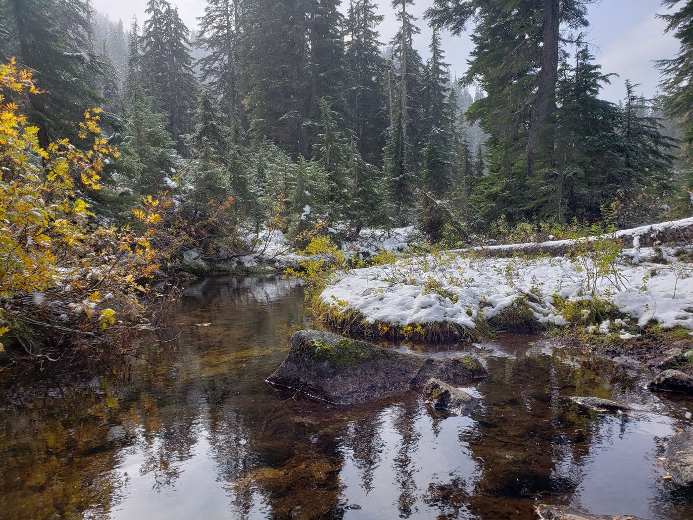 Now, our hike started from the Steven's Pass trailhead. My hiking partner and I started out at about 11:00 AM from the trailhead, with only about 4 other cars in the parking lot. There were snow flurries, but the temperature wasn't bad and the snow didn't stick for long. Low clouds and the snow flurries made for quite the somewhat surreal hiking views through the occasional breaks in the trees. The first couple of miles of trail weren't difficult at all, being relatively dry with not much in the way of mud or other obstacles and a gentle grade. Around the 3 mile mark, when you start in to some elevation gain, there were some spots (especially through the meadows) where the trail turned to a mud track and required some careful stepping. As you keep climbing, the snow has covered the trail in places. It's not hard going, but there are rocks buried under the snow, so be careful where you step.