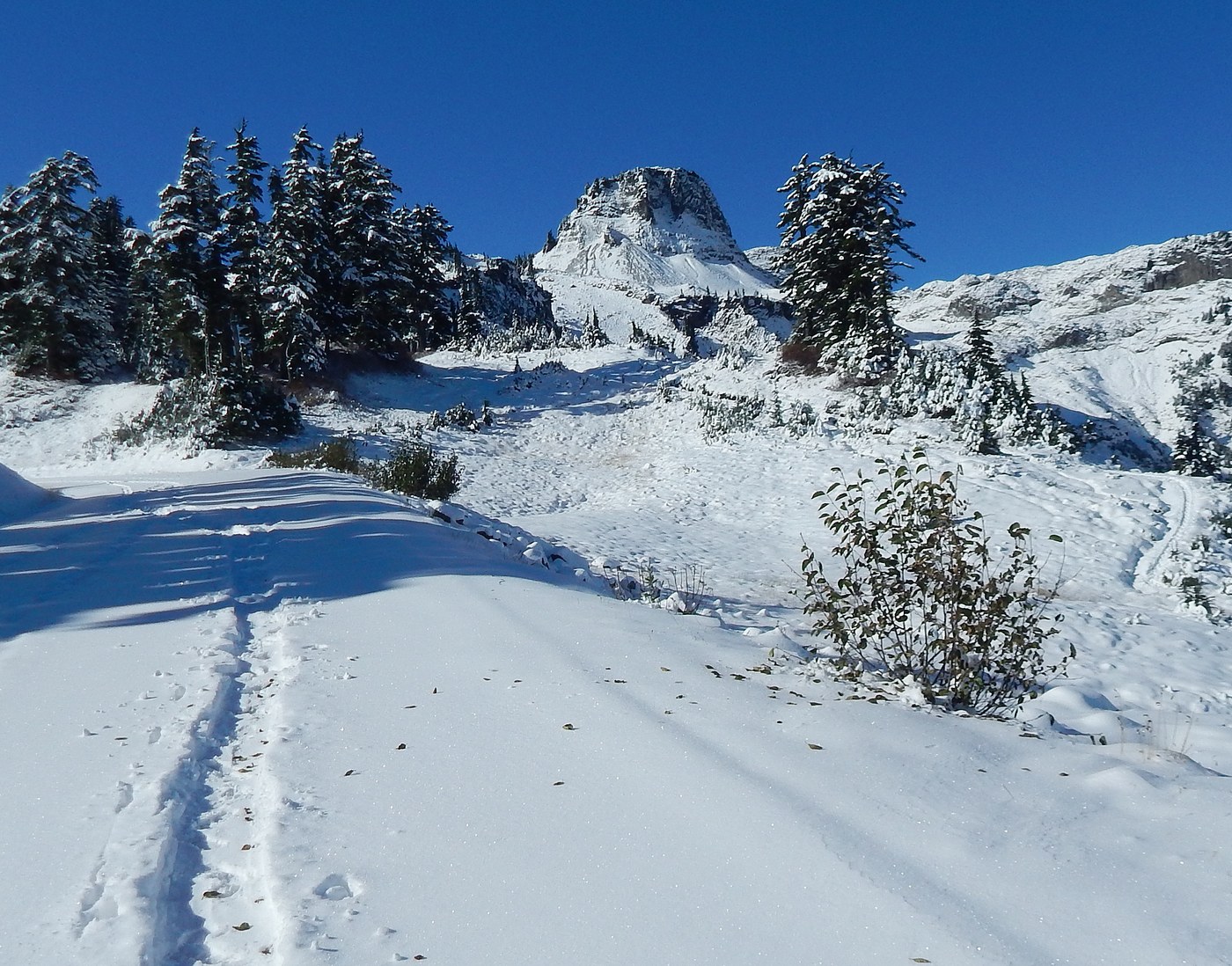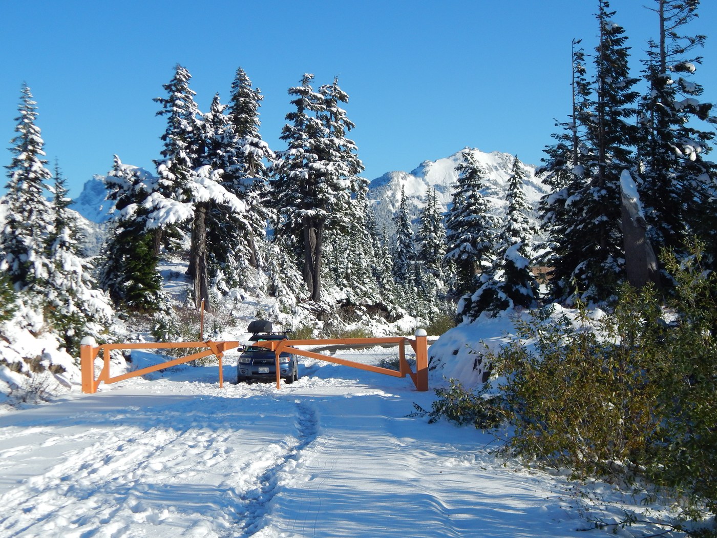 I had been trying to get to Artist Point all summer. Finally got there today. But had to walk there from Heather Meadows. The dropdowns do not allow me to accurately describe the conditions. I hiked the closed road from Heather Meadows to Artist Point. The road was clear all the way to Heather Meadows. Above there the road is closed. Plows had been busy and the road was cleared and sanded. There was 6-8 inches of snow on the road from the parking lot all the way up to Artist Point. I was able to use tracks left from some skiers who had come down the road. This was much easier than breaking trail with just my hiking boots. Didn't remember my gaters, they would have been helpful. I had a pole but no need for traction devices, your results may vary. Took 90 minutes to get to the top. Rested in the restroom. Stinky, but a snowless place to sit and rest. Saw the only other people while I was on my way down. One of the guys asked me between drags on his cigarette if Baker was still there. Amazing walk down. The drive was great too. Wonderful fall color and light. The stillness I experienced on the way up leaves me speechless.