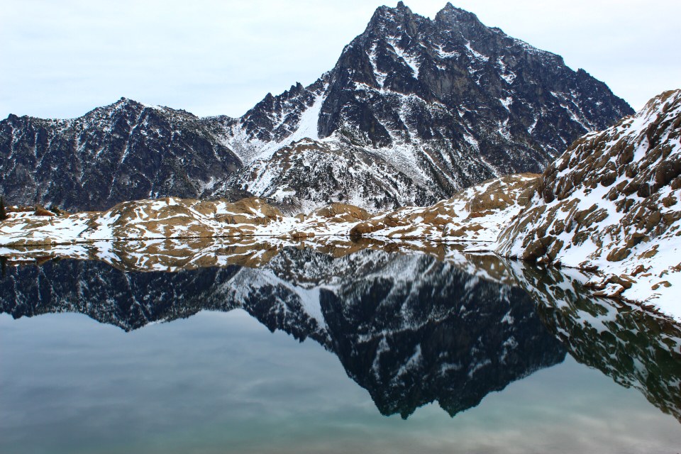 On the way up, the ground and mud was frozen over. We encountered snowfields as we walked down to the larches but walked on a well-traveled trail of compact snow. The only had trouble we had was climbing the rocks in the last 1/2mile to the lake. The trail was very icy here and we took our time getting up.