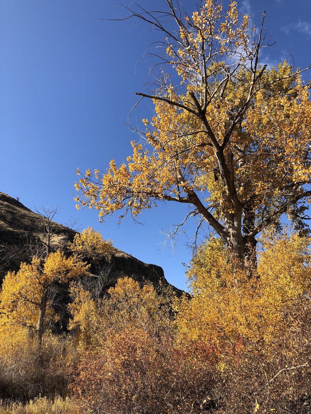 Swinging suspension bridge, rambling river, groves of apple trees, a chattering creek and remnant of an old homestead ~ but the show stopper was the glow of the young Aspens along the canyon floor.