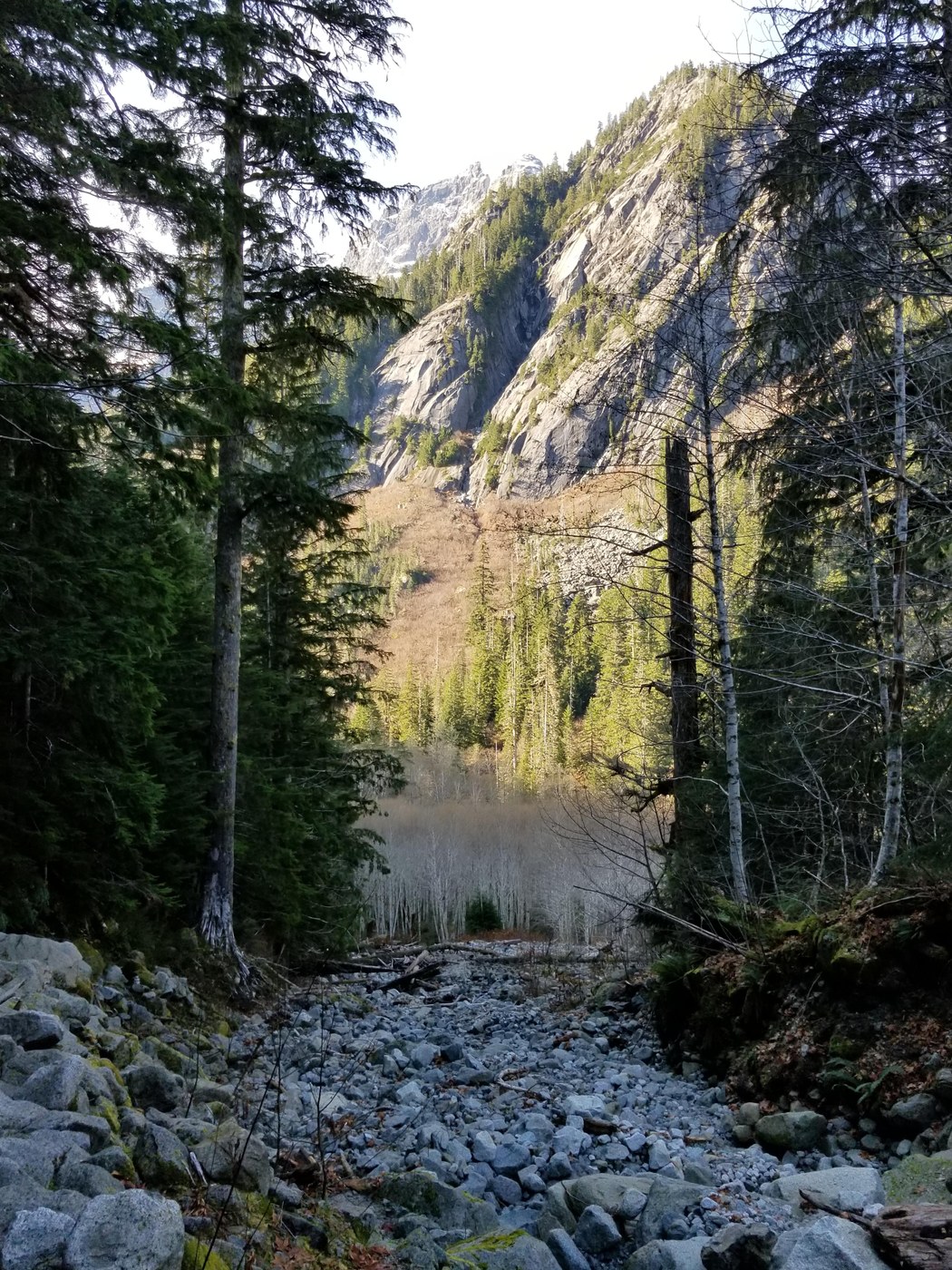 What a difference a few weeks makes during the shoulder season. Two weeks we were in over a foot of snow at 4000' (Curry Gap) and this week no snow at the same elevation at Squire Creek Pass. What a gorgeous destination on a sunny fall day with both Three Fingers and Whitehorse Mountain in full view and peekaboo mountain views starting early in the hike. The pass is a vast gently-sloping granite slab with multiple large white rocks that are perfect for sitting. There were some frozen granite slabs just below the pass and a few frozen waterfalls above the scree slopes we traversed, but nothing we had to cross. The creek crossings were all quite do-able without getting wet.