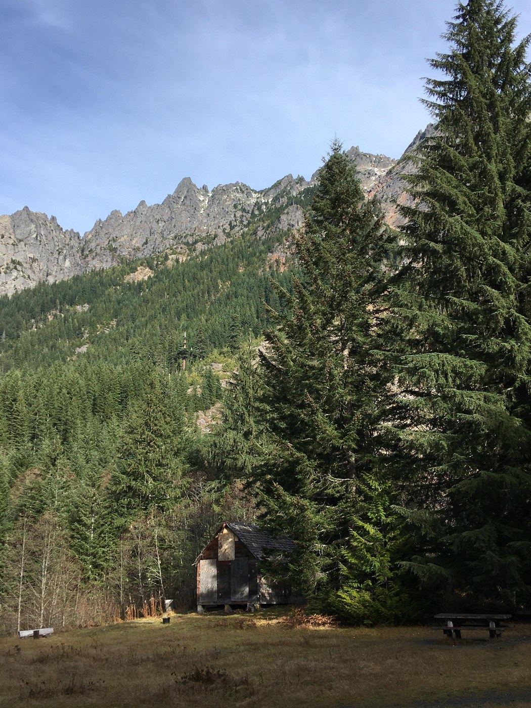 We thought it would be faster if we rode our bikes on the maintenance road to Monte Cristo instead of walking. The maintenance road starts about 1/4 mile over Barlow Pass, just beyond the bridge. It’s a pretty rough road with a lot of rocks and a lot of ups and downs. We needed mountain bikes! We were constantly getting off and on the bikes trying to avoid either the rocks or the grade. Once the road joined the trail that starts at Barlow Pass things improved and we zipped along. It was fun exploring the town, reading about the history on all the signage. We hiked about a mile on the Glacier Basin trail, till we could see the waterfall off to the left.
