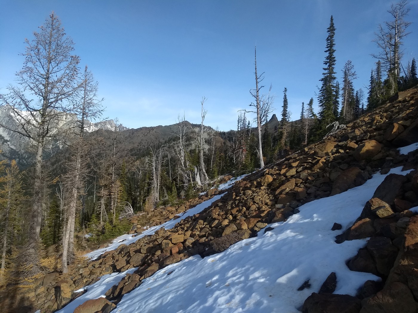 At the junction of the Fourth Creek Trail, we headed up to the saddle east of Bills Peak, and then up Hardscrabble to a (limited) view of Stuart and the Ingalls Creek drainage. This was good scramble practice: we had a range of climbing abilities, from someone who climbs nearly every week, to those of us who haven't done it in years (me), and with some coaching, all of us made it to the viewpoint.