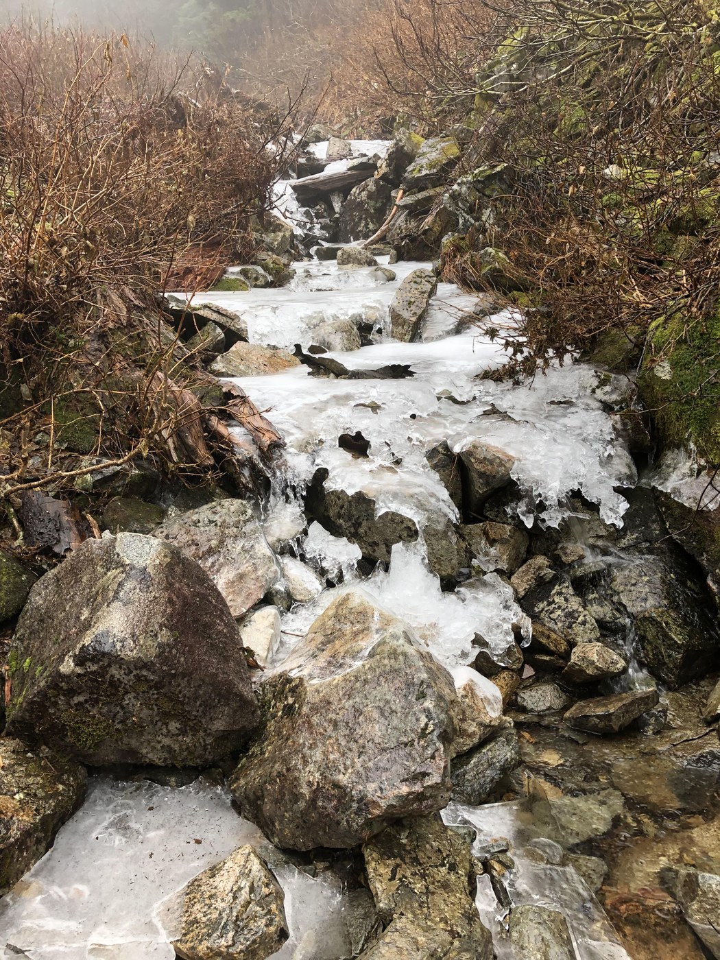 Trail Conditions: The first 2 1/2 miles of trail are very well-kept and in great condition. About 1.5 miles after crossing Denny Creek and getting onto the "main trail," just before the second crossing of Denny Creek, there was a stream to cross that was very icy for about 15 yards. It's not difficult to cross, but care is needed. This was the only snow/ice on the trail. Just after the second Denny Creek crossing, there was a rather dilapidated wood walkway with a handful of very weak spots. From that point to the top, the trail alternated between extremely rocky (some pretty rough talus fields) and quite muddy and wet.