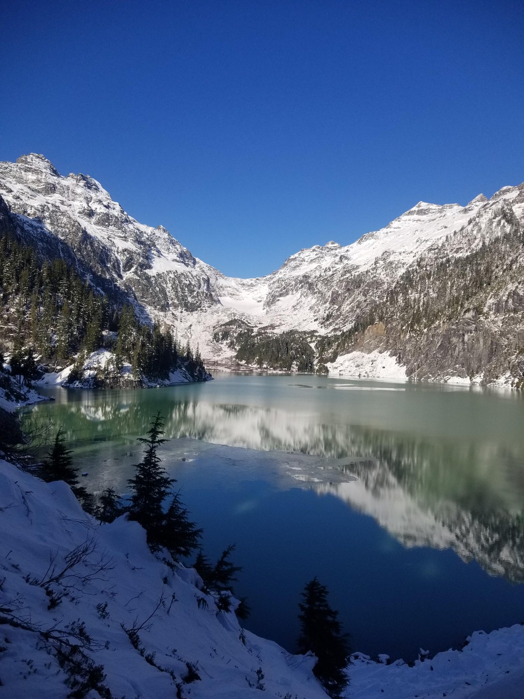 The trail itself is mostly packed snow and ice. Trekking poles or microspikes recommended. It was a pretty moderate climb to the ridge, but the descent from the ridge to Blanca Lake is steep and icy. Again, poles or microspikes (or both) should do the trick.