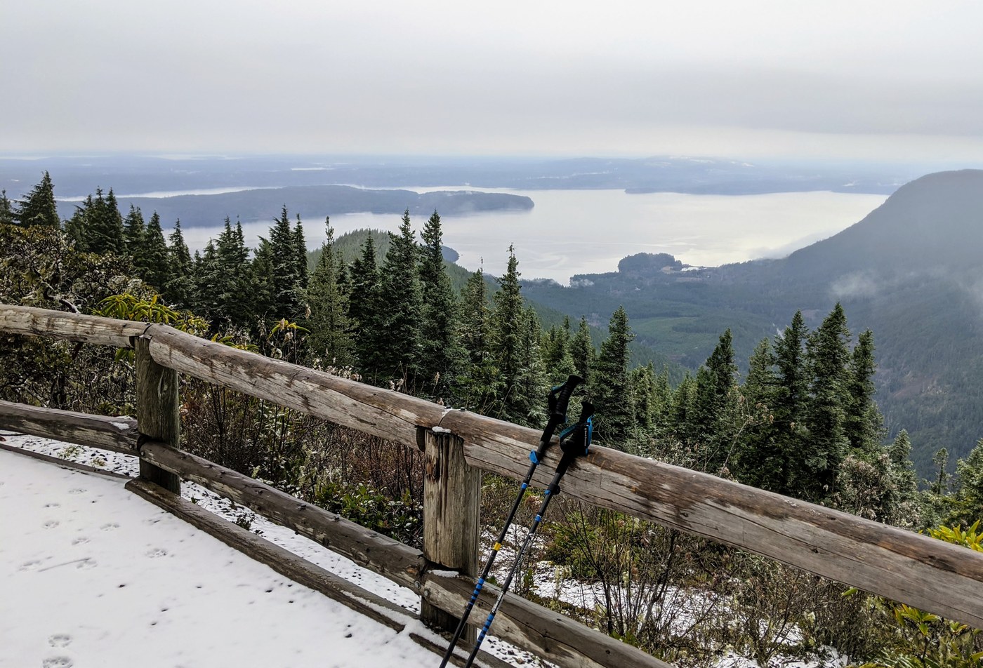 Trail was in great shape, thanks to the WTA volunteers who worked this trail the day after Thanksgiving. I hit light snow about halfway up, but it was no impediment. Made the footing a bit slippery on the way down. Cloud cover was low, and there was no view from the north summit, but from the south summit I could see Dabob Bay, Hood Canal, Kitsap Peninsula, and even downtown Seattle.