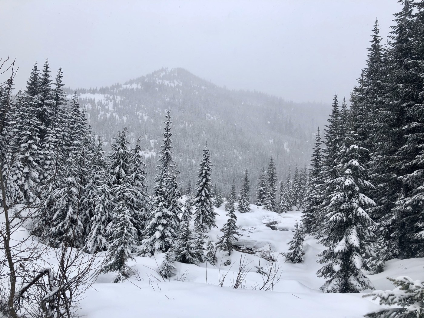 We had a great time today on this trail! It is snow covered in a couple feet of snow the whole way, but the snow was hard packed from all the foot traffic. We used snowshoes, but the trail could be done with microspikes or probably even just in hiking boots if you don’t mind postholing and slipping now and then. The trail has a nice, easy uphill grade to give you a good work out without completely wearing you out. We were lucky that the mountain peaks came out for us a little for us today through the constant snow. The whole hike took us about 4.5 hours, with a 30 min break at the lake for some food. This was my first time snowshoeing, and I highly recommend it! Very beautiful and peaceful.