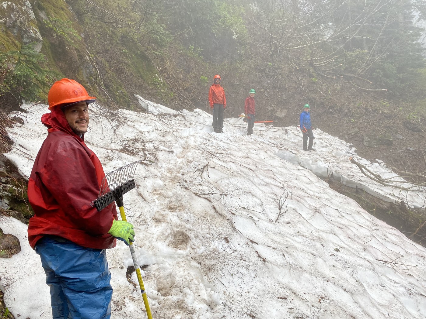 There is one snow bridge beneath Bluff Mountain that will melt out in a week. Be very careful crossing the snow bridge as it is about a 5 foot drop and the snow bridge will thin until it collapses with the coming warm weather.