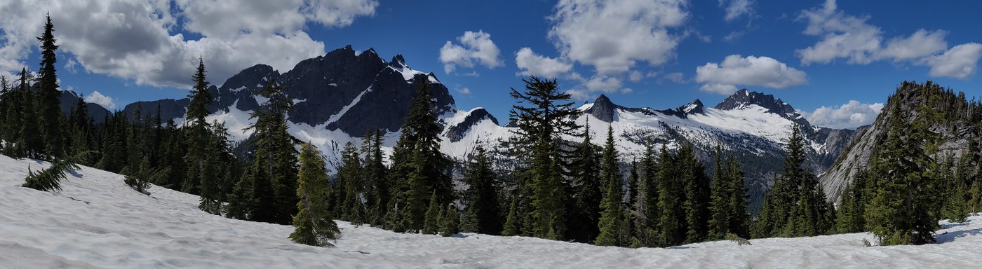 The trail itself is somewhat steep and not well-defined in places but is in generally good shape up to around 3600', where snow coverage begins. Snow is constant from 3600' to the top of the pass at 4000'. Some route finding required on snow, but nothing too difficult. Snow was soft around 2pm and mostly low angle. I felt comfortable without poles or foot traction. Earlier in the day I would recommend poles and at least microspikes. All major creek crossings had enough snow coverage to make it across, but I did punch through a couple times up to my thighs in various places. I did the hike in approach shoes and was thoroughly soaked after boot glissading down the snow fields, so either embrace the wet or bring some gaiters.