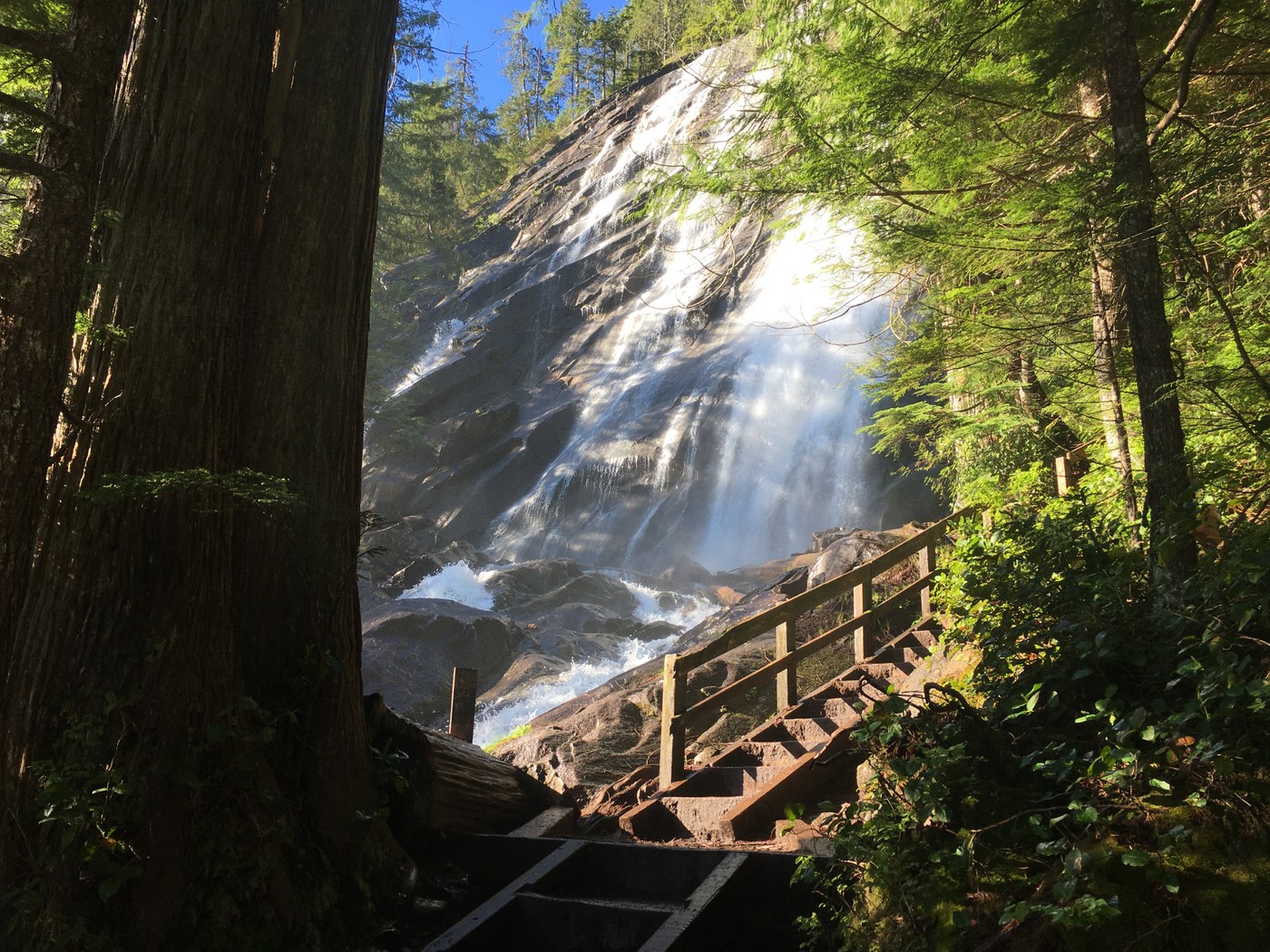 Hiked Bridal Veil Falls with my Golden Retriever Ginger on a sunny Saturday morning. After the 1st half mile of the trail, I got waylaid by a spur trail containing a number of downed trees and branches, a half dozen creek crossings, and steep embankments to go up and down. Fortunately, I eventually found the main trail, and did not pass through this section on my way back! The 1/2 mile spur to the falls is incredibly rocky…I found myself moving at a snails pace, trying not to twist an ankle. Thankfully, it is over soon. At 8:00 in the morning, the falls were not terribly over-crowded, which was nice. On the way back, I was overwhelmed with people heading back and heading up. Expect to spend a lot of time waiting for people to pass, especially on the “stair” sections near the falls. My dog revelled in all the human attention, and loved every minute of the hike back! All in all, everybody practiced good trail etiquette, being friendly and saying “hi”, taking turns passing, no loud music and no trash. When I got back to the parking lot at 10:00, there was a line of 8 people waiting to use the loo! The lot was full, and cars were parked both directions along the road for at least a quarter of a mile. All in all, a good way to spend a Saturday morning.