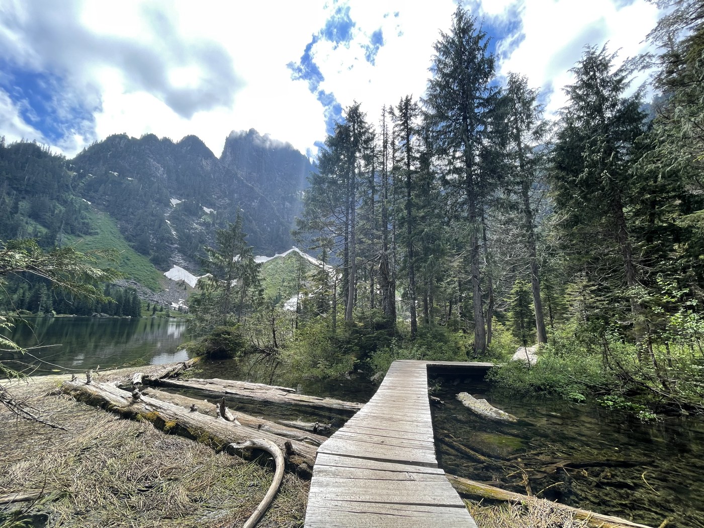 Snow started to appear next to the trail in the last maybe quarter of a mile or so of the hike, but there was none on the trail itself. The lake was absolutely beautiful on this gorgeous day, with clear turquoise waters and the top of the mountain in the backdrop covered with mist and clouds. I walked counter-clockwise on the loop around the lake and found a big rock on the water to sit on and eat my lunch and snacks. There were quite a few bugs and mosquitos specifically that were buzzing around me while I was resting, probably got a few mosquito bites but it was not terribly annoying. After about 45min or so enjoying the weather and the views, I decided to head back down. Overall my watch tracked 4.92 miles in 2 hours 17 min, excluding the amount of time I spent at the lake. A morning/afternoon well spent, now that summer has finally arrived :)