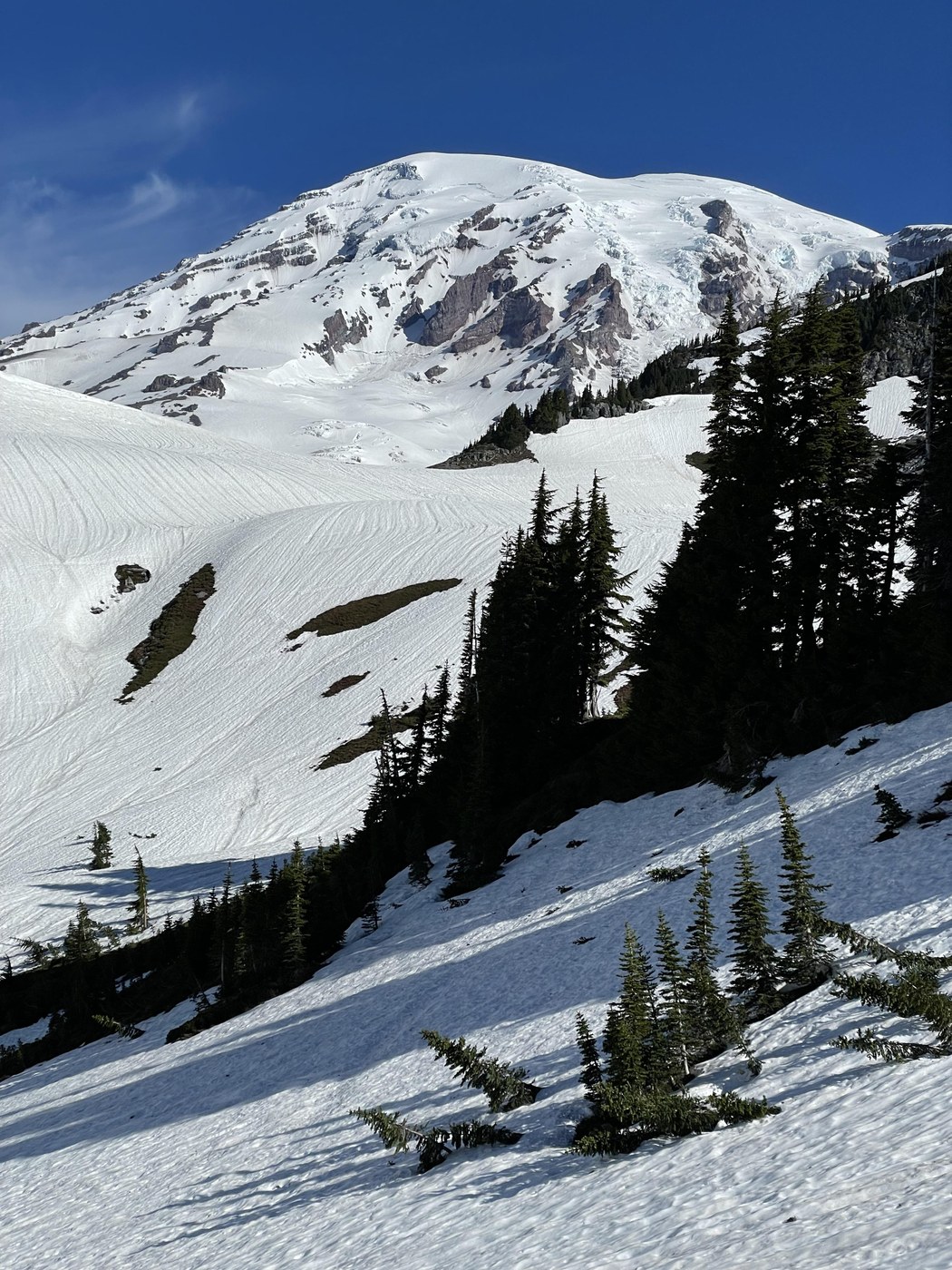 I hadn't planned to hit Paradise, too much snow, but the mountain truly was calling. I arrived at the Jackson Visitor Center at 7:45 on a beautiful Saturday morning. There was still parking in the main lot and a lot of parking in the back up lot. After talking to a ranger I chose the Edith Creek Basin Route. That early, it was still icy. I donned my spikes on my trailrunners and baskets on my poles. I followed the orange poles to the bridge over Myrtle Falls. The falls lookout is not accessible right now and the trail to the bridge is steep and slippery (this is the preferred route for visitors). Once the poles ended, I shifted left to the Golden Gate trail. I've been on it so many times, but never on the snow. I saw a couple marmots. I could see the Alta Vista waterfall and hear a lot of water running under the snow. I steered clear of the valley. I made it half way up Golden Gate before I turned around. The sun was blazing and the steep slopes whispered threats of avalanches (along with the ranger who did not whisper the threat). In the short time it took to make it a mile and a half, the snow was already super slushy. I was sliding and sinking in. The views were outstanding. The mountain was wagging its tail and totally showing off this morning. I said a big thank you and happily got off the snow. In the patches of melted snow, wildflowers are starting to bloom. I'll try again in a couple weeks. For now, it's not super fun on that kind of snow at this time of year. Stay safe, bring poles and the right gear.