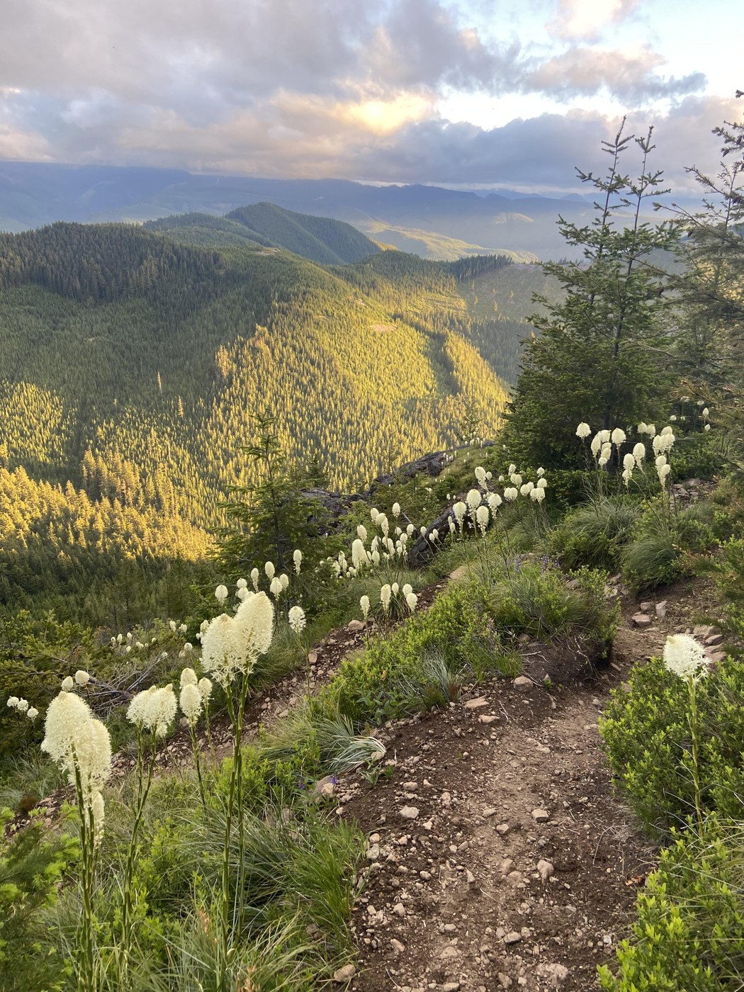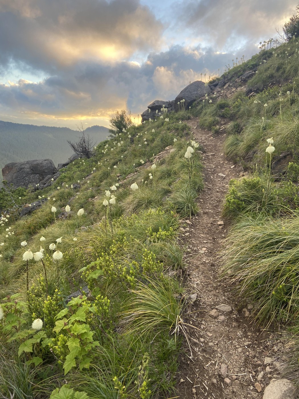 We hiked this for a sunset view, starting the trailhead just before 8pm. The trail starts out easy through the woods, then goes through the most beautiful area of bear grass, rocks, and switchbacks. The air was filled with a very aromatic scent! It levels out before you get to the top. We were eager to get to the lookout and made it just in time to see the sun set…the clouds were sweeping in which made it feel really magical. Then we started down while we still had a little light, and pulled out the headlamps about the time we got to the rocky switchbacks. Fortunately, those lights are bright! We made it back to the car and started driving at exactly 10pm.