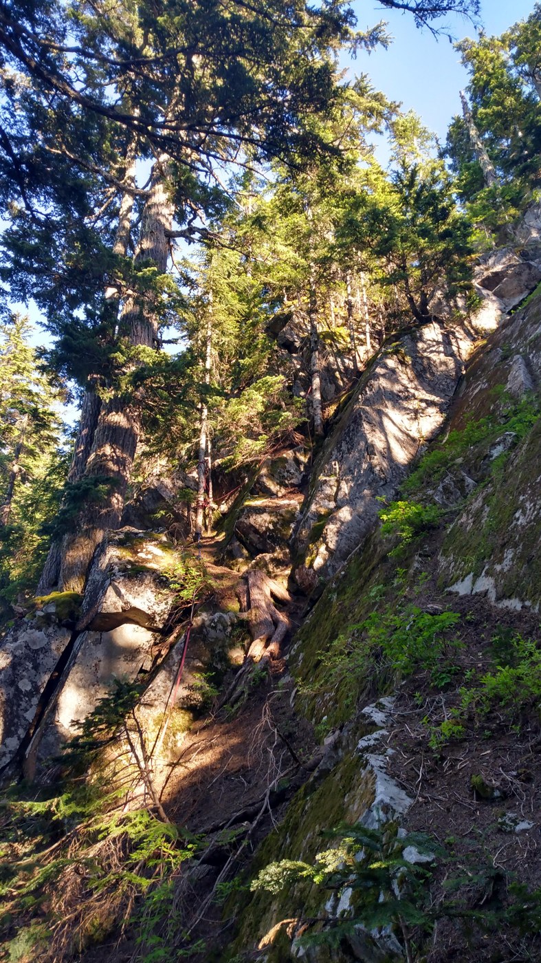 The 50 feet or so to get to the ropes was very slippery hemlock duff. The old hemlock forest on the ridge leading to Dirty Harry's is much easier to travel through than the dense, younger growth towards Dirtybox. I can clearly see the dividing line in one of my pictures.