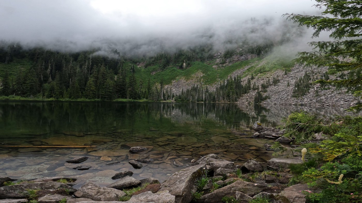 When you get to the lake, the trail becomes a little less clear as there appears to be little spurs that head in a number of different directions. Ultimately, they all put you at the edge of the lake for a beautiful view. Unfortunately for my hike, the morning cloud cover had not burned off yet, but the lake was still beautiful none-the-less.
