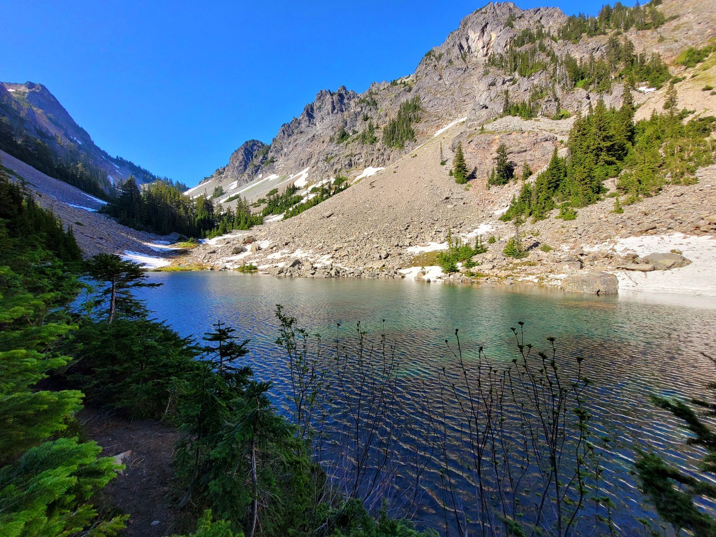 I did a 4-day loop through the mountains between North Bend and Snoqualmie Pass in the Alpine Lakes Wilderness. I covered around 60 miles w/10,000ft or so of gain in three days (the fourth was a zero day for fishing). 90% of the entire loop was snow free, with the climb up Mt. Defiance from the NW being pretty much the only part with snow; though it's enough that it still requires some routefinding. All the trails I travelled are in generally good condition with the exceptions of Mt. Defiance and Rock Creek. Both trails are popular with runners, so its easy to see and follow (when not under snow) but the tread is sloping and washed out in many places and there are numerous down trees to climb over/crawl under. Rock Creek in particular is thickly overgrown in places with 6ft tall shrubs and ferns. Also, if you didn't get the memo, the Snow Lake trail remains open until July 29th! If you didn't get the memo before the memo, yes, the Snow Lake trail is being closed for repair work.