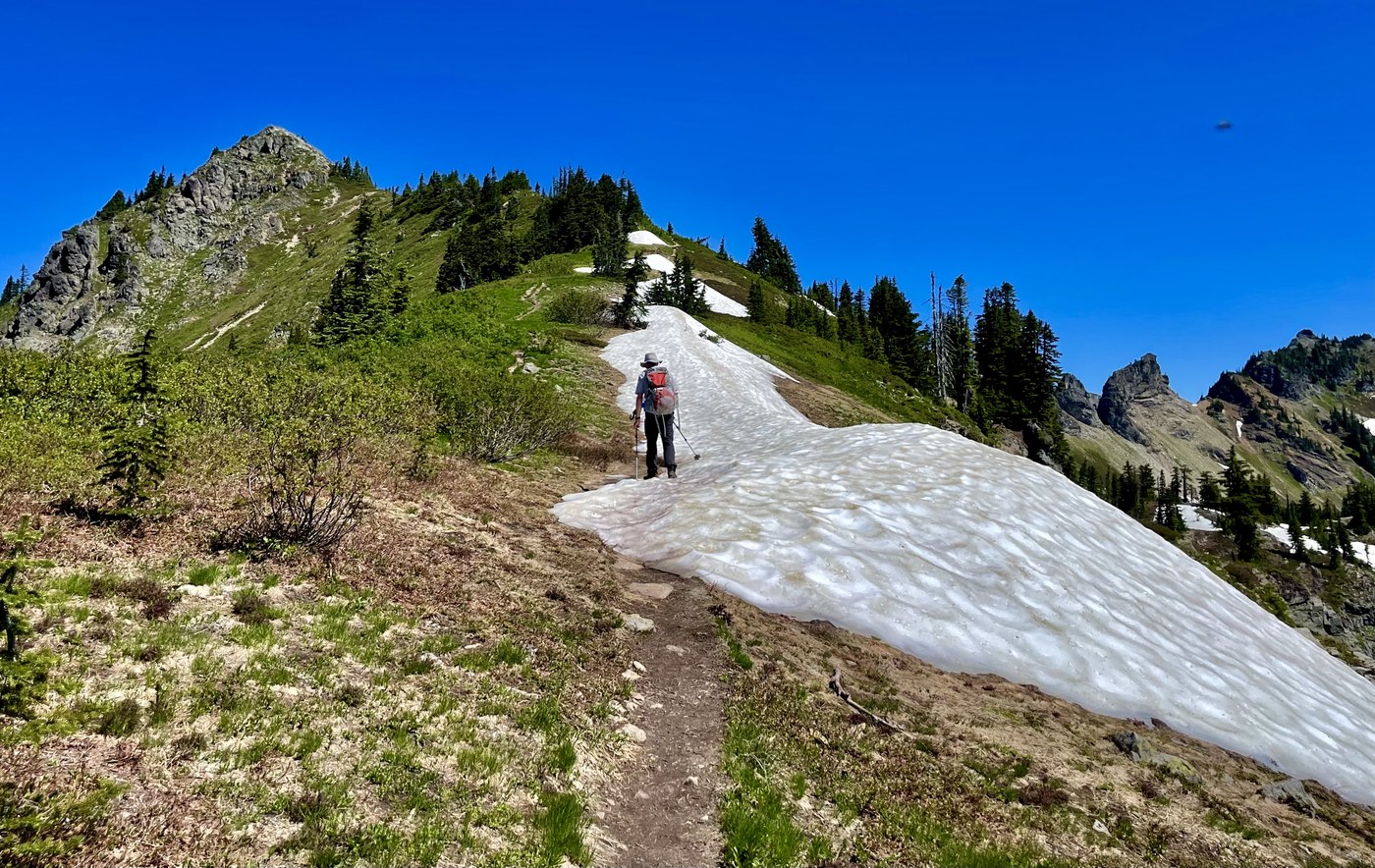 Rachel Lake to Alta Mountain (2 hrs one-way): Small patches of snow to cross did not present a problem - no micro spikes needed. THE VIEWS! My favorite was being able to see the tiny trace of the PCT on Chickamin Ridge.