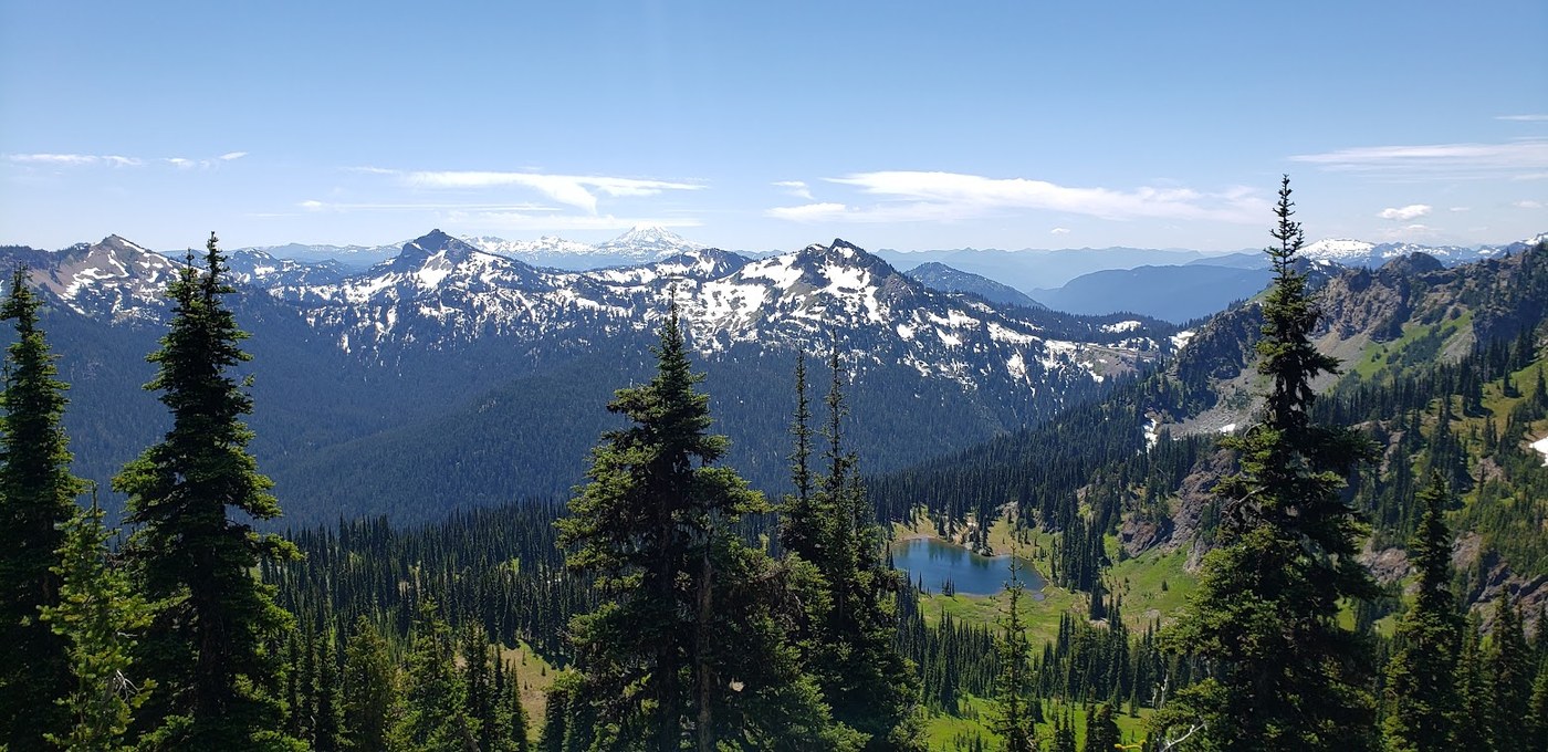 The lower Crystal Lake was prettier than we expected. We paused there for a photo and then continued to the upper lake. There's a great view of Rainier just off of one of the switchbacks on the way up. Arriving at the upper lake we were wowed by the beauty of that place. After lunch, we continued up to Sourdough Gap and were very glad we did. The views of the lake and Rainier were spectacular and on the other side of the gap, we could see Mt. Adams, Hood, and the Goat Rocks Wilderness.