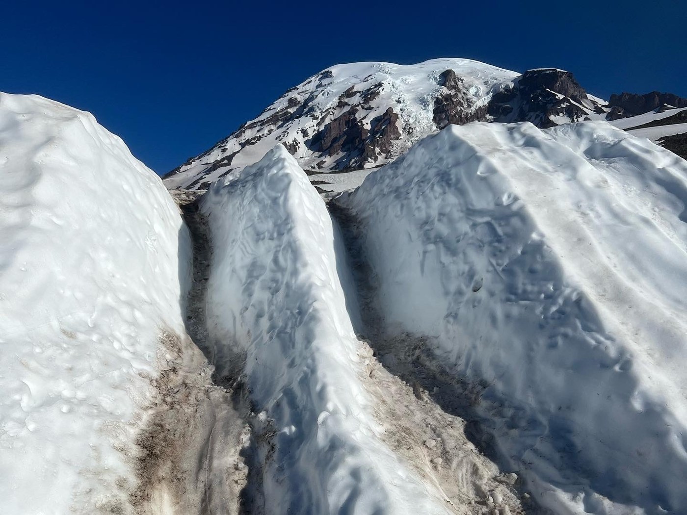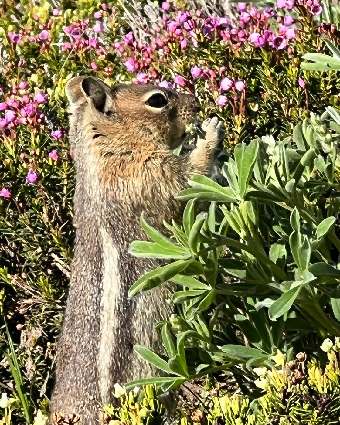 Arrived at the Paradise parking lot at 6:30am. The main lot by the visitors center was almost full already. Decided to combine Golden Gate with Skyline & do it counterclockwise to avoid any traffic jams as it looked like the day would be a crowded one. The snow on the trail didn't start until after the potable water area to the left of the trail. From there on up the trail was compact snow & ice & I'm glad I brought my hiking poles & microspikes. At the top there was intermittent compact ice & snow fields all the way to Panorama Point. Nothing really bad but poles & microspikes really helped & although it got tiresome putting the microspikes on & pulling them off every so often it was well worth it in the end. I had the trail to myself up to Panorama Point & it was there that I started to encounter a steady flow of people heading in the direction I had already been & that flow increased dramatically after passing the turnoff to Pebble Creek which is also the area where there were the sketchiest of conditions. Undermined snow drifts caused quite a backup for unprepared people trying to do the hike in tennis shoes. The rest of the descent was mostly over softer snow that had warmed in the direct sun and the snow persisted almost to where the asphalt trail meets the dirt trail. I started the hike at 6:45am and was back in the parking lot by 10:15am after having been gifted a beautiful day filled with tons of wildlife sightings & wildflowers starting to pop in the areas with no snow. Deer, marmot, chipmunks, and even a couple of goats were on display. I've never seen goats at Paradise before but it was a fantastic surprise! On a final note, while driving out of the park, there was a line of cars stretching from the entrance all the way down to the Copper Creek Inn by about 10:45am on a Saturday morning. I'm so glad I went as early as I did. I've tried to add pics to this report but haven't been successful.