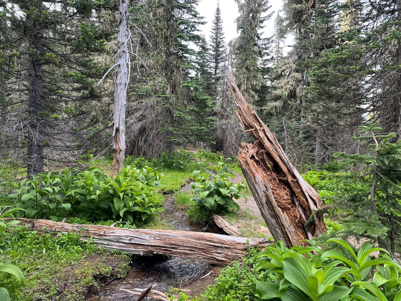 Day 3 - South Toutle River to Butte Camp was tough at the beginning but ended really beautiful. We knew ahead of time that no water was being reported between the river and June Lake so that was some of the motivation for spending an extra day, the other was more obstacles than we cared to tackle in a single day. From the river the trail climbs for quite a while until topping out in some really pretty pine forests. It undulates through forests that make quick work of hiking until you get to one really large washout that has you detour a substantial way downhill to another set of ropes. The rope going down on the north side was much more difficult than the south side because there's a narrow slot you have to crawl into and the rope isn't really long enough to get past all the talus at the bottom. We had a map of other areas that were reporting ropes but on our trip, we only had two sets of ropes over the entire loop. There were just as many washouts in this segment as the previous day but they were less strenuous. Connecting to the Butte Camp trail was glorious. The trail sign says 1 mile but its actually about 1.4 miles to camp. There's options to dry camp several places before you get into the more heavily treed area but we wanted to camp near our water so we went all the way in. What an oasis! There was a nice little stream that flowed next to the trail and lots of space to spread out here. The trade off was flies at night and mosquitos in the morning. We had one other party camp near us and no one else around. This stretch took us about 7 hours with lots of stops.