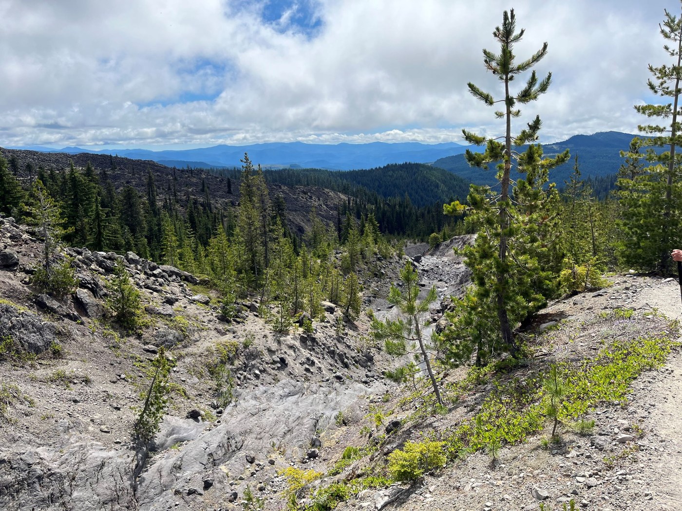 Day 1 - June Lake to Pumice Butte was beautiful and since we started on a weekday, there weren't very many people out. The trailhead had several cars parked which looked to be overnighters, still lots of space to park though. Note that there is no privy at the trailhead. There were a couple blowdowns on the June Lake trail but they were easy stepovers and one harder to navigate large one that required crawling up on a ledge and onto the tree to cross. This one was on the connector trail from the behind the lake to the junction with the Loowit. After that it was pretty smooth sailing, hiking through the first set of boulders with views of Mt. Adams and Mt. Hood. We crossed several ravines, some of which had water and others didn't. We ran into a solo trail worker near the Shoestring Glacier with a huge pick axe. Thank you for helping improve the trails! We saw very few people until the junction with Ape Canyon and people were everywhere. It's a beautiful view there with some space for dry camping. We continued a little further to our camp for the night at Pumice Butte which took us about 6 hours with lots of breaks and photo stops. There was a spring there with wonderful water and we took the campsite on the ledge with gorgeous views of Adams, Hood, and Jefferson on one side and Helens on the other. Three other parties camped in the same area with us that night during the Supermoon. It was an incredible camp except for the runners who woke us up at 3:30am giggling with flashlights as they came through.
