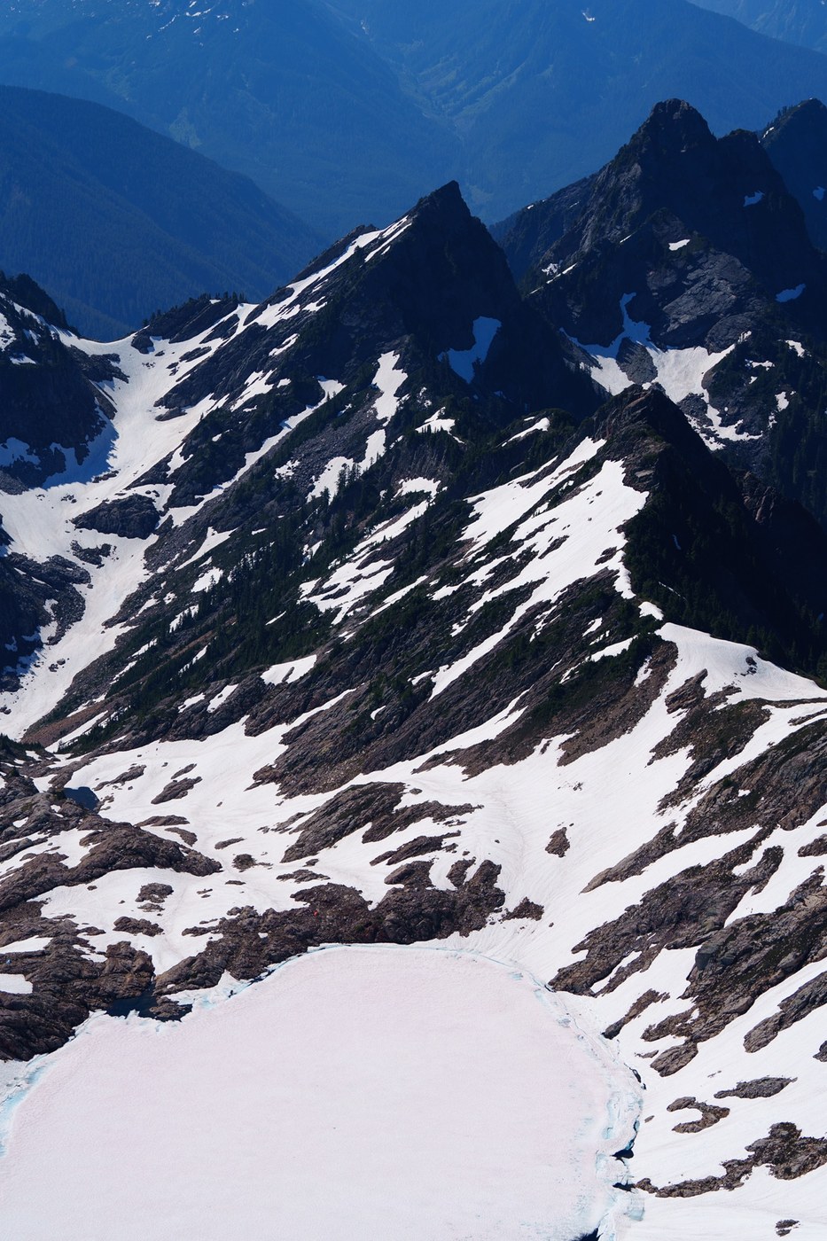 A few challenging snow bridges to navigate on the way in. Conditions changed rapidly from day 1 to day 3. Continuous snow in the basin up to the lake. Many dry campsites around Foggy Lake. Ice axe and crampons used to gain the steep snowfield to the base of the rock. Microspikes would’ve been ok. The first rock bit is very steep with class 4 moves. If you take your time can find a ledge system up. The upper but up the climb had a few challenging moves. The summit provided views of all the volcanoes and North Cascades. A challenging, beautiful scramble. Was excited to finally get up it.