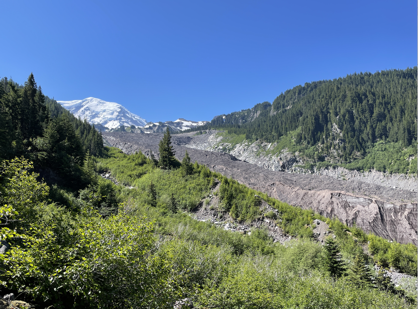 We headed up again to be met with the Winthrop and Carbon glaciers to our left. There were a few lingering snow fields leaving the meadow and as the Carbon Glacier began to appear so did the grinding heat.