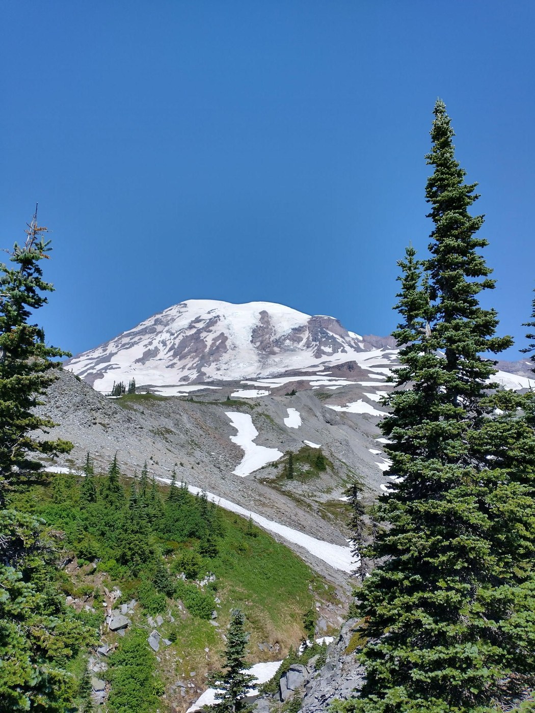 Bluebird day on the mountain. Had a 30 minute wait getting into the park around 9AM. Line was 2 miles long when we left in the afternoon! We hiked from Narada Falls up to Paradise then took the Golden Gate trail up to Skyline. Then over to the Lakes trail and down to Reflection Lakes. From there we took the Wonderland trail back to Narada Falls. A nice little loop. We prefer to do this loop clockwise as it gets the majority of the climbing done first. As expected, Paradise was a zoo overflowing with people. Skyline trail was jammed pack. We found periods of solitude on the Lakes trail which was nice. A few snow patches on the Skyline trail and while slippery, they didn't provide too troublesome. Other trails were in pretty good condition if not a little dusty. No bears today but we saw several marmots, deer, and grouse along our journey today. Flowers may not be at peak but were plentiful. Note that the regular restrooms are closed at Narada Falls but port-a-potties are available. Some bugs out but they weren't too bad -- the breezes helped keep them manageable.