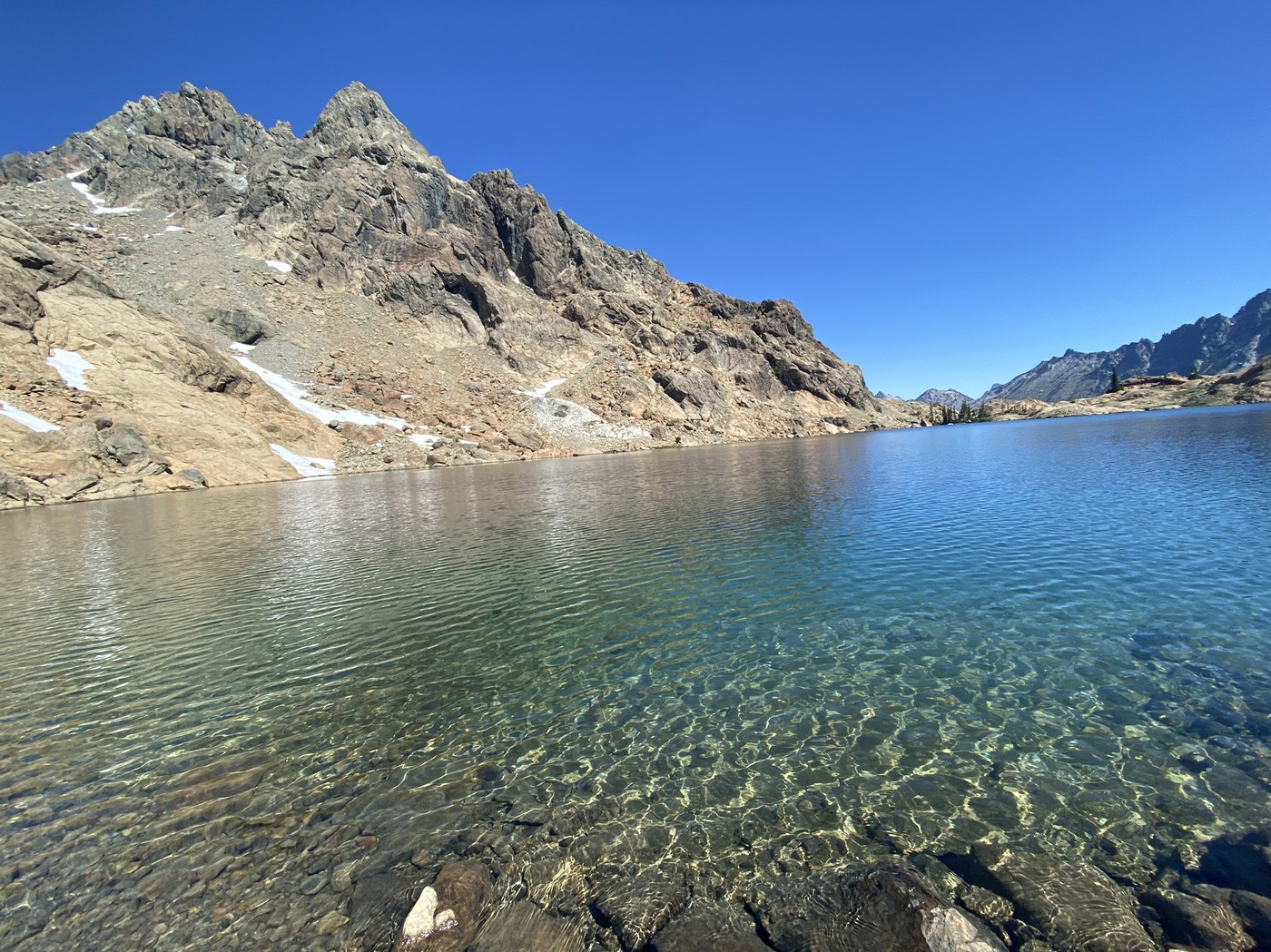 The road up to the trail is on pretty good condition, some wash boarding but nothing crazy. We started at 8am, and glad we did. It was 43° when we started and 86° by the time we got back to the car. The trail up to the 3 mile mark is straightforward and easy to follow. At the top of the ridge, we chose the left path, to make it easier on the knees. Very rocky, wear a shoe with a solid sole. The lake is completely melted, very clear and there are lots of places to spread out to enjoy the view.