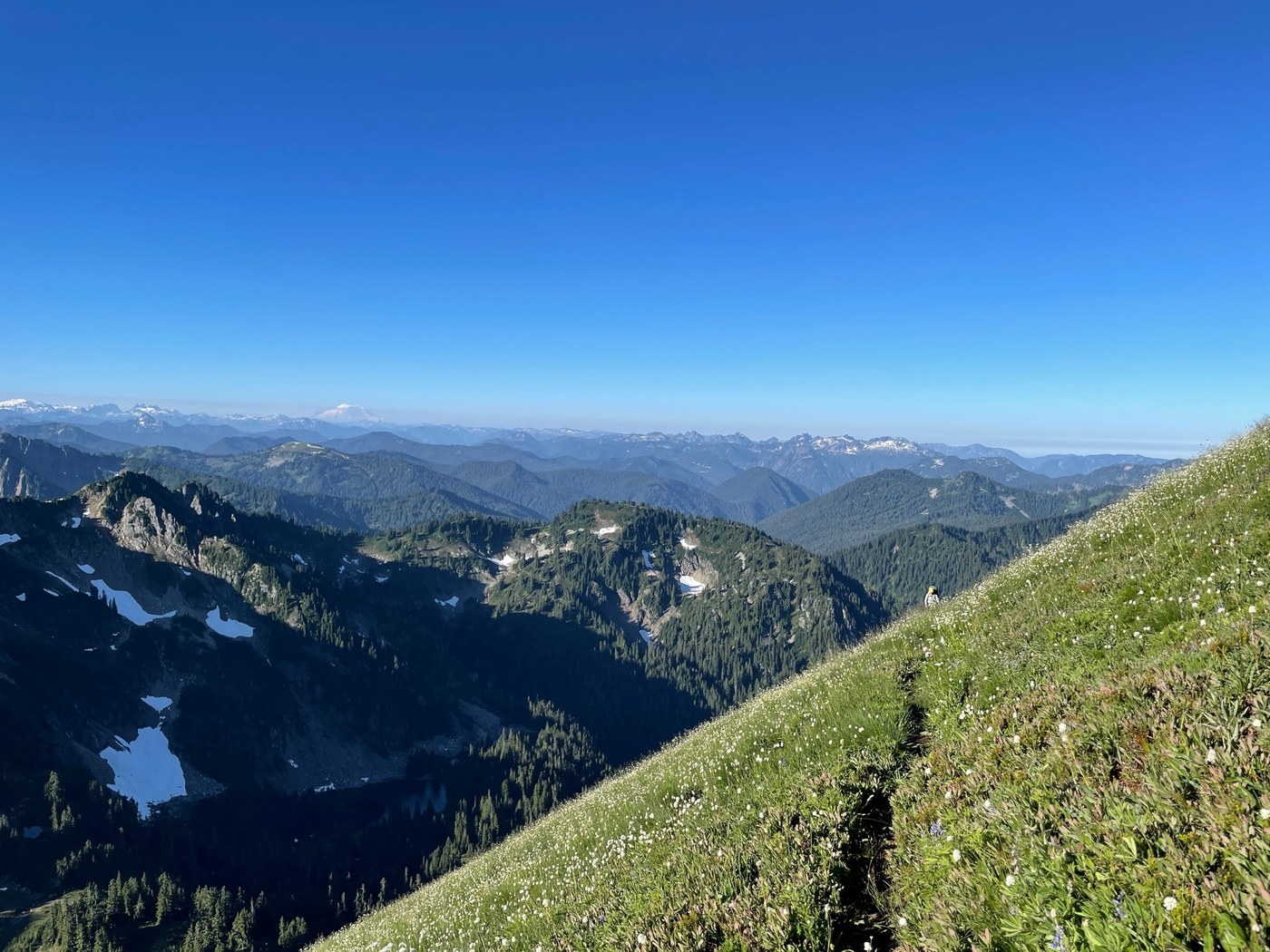The last day we got out early and headed for Johnson Mountain which is absolutely beautiful. We had our breakfast at the top which was a huge treat! If you do this trip Johnson is an absolute must do. It was cool to see the the remains of the old fire lookout and of course the 360 degree views including Baker, Rainier, and, of course, Glacier. The rest of the day passed uneventfully although the descent down to North Sauk is definitely tough. Bugs and all, this trip was amazing and would strongly recommend to others. Total trip was ~31 miles with 8500ft of gain.