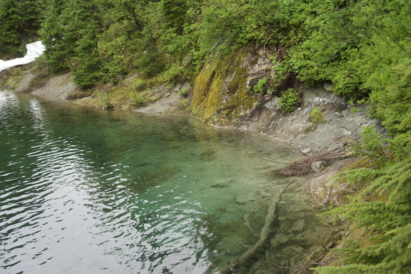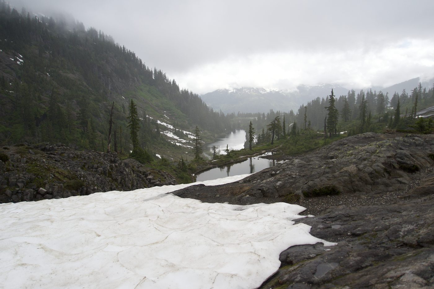 Farther down around Heather Meadows and Bagley Lakes, there's far less snow, but still some snow fields to cross. I only went a little ways on the Chain Lakes Loop around the Bagley Lakes/Heather Meadows area due to the snow. There's small fields on the trail that are pretty crossable lower down (just look out for deceptively unstable snow bridges), then as you start climbing toward the saddle it becomes much more prominent. Bagley Lakes is still pretty frozen over but starting to show signs of thaw.